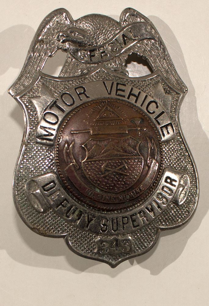 Special Motor Vehicle Deputy Supervisor, No. 348. Copper center (historical coat of arms) with miners picks, on shield and "Nil Sine Numine" on a banner beneath. Tin shield had an eagle at the top. Nil sine numine is the state motto of Colorado. The Latin phrase appears to be an adaptation from Virgil's Aeneid where in Book II, line 777 the words "...non haec sine numine devum eveniunt" are found. The motto appeared when Colorado's first Territorial Governor William Gilpin asked the Secretary of the Territory L. C. Weld for a suitable motto for the state seal. According to the story, Weld said: "Well, Governor, what would you suggest?" Gilpin is said to have paused in thought for a moment and then responded "Nil Sine Numine". On November 6, 1861 by Joint Resolution the First Territorial Assembly adopted the motto with the territorial seal. At recurring intervals, discussion has ensued concerning interpretation of this Latin phrase which commonly translated is "'Nothing without providence'". Others say it is "Nothing without God". Merriam Webster's translates it as "Nothing without the divine will". In the early mining days of the State, the unregenerate said it meant "nothing without a new mine". The word "numen" (ablative numine) means any divinity, god or goddess, or divine spirit.
