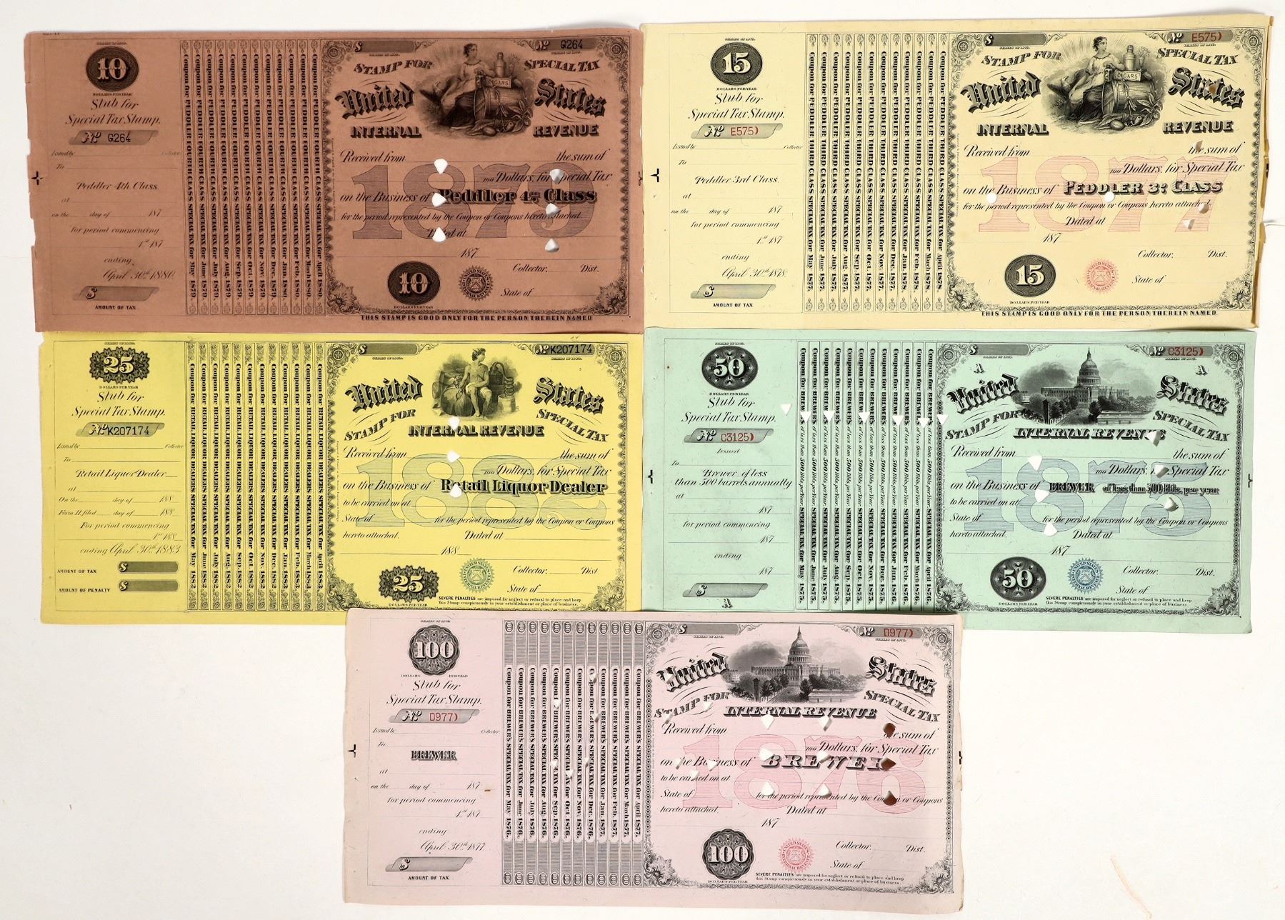 Lot of 5 different. Unissued. Includes: 1877 Peddler 3rd Class, 1882 Retail Liquor Dealer, 1875 and 1876 Brewer, and 1879 Peddler 4th Class.
