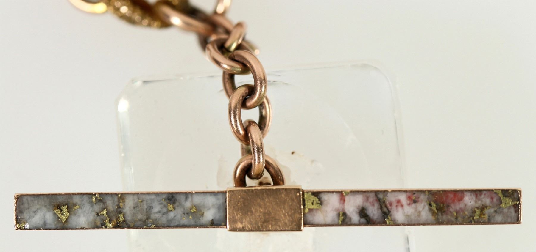 The watch chain is an eight segment (each 1"), 13" long gold quartz chain with a side-hinged gold quartz photo locket at the end. The gold "cross-tie" has gold quartz on the outside, which is unusual, as most are a simple gold cross-tie. Each of the gold quartz segments are encased in a 14kt gold setting. The quartz itself may be indicative of California gold. There are traces of red and black mineral stain typical of the southern mother lode region. No maker or jeweler mark is present.