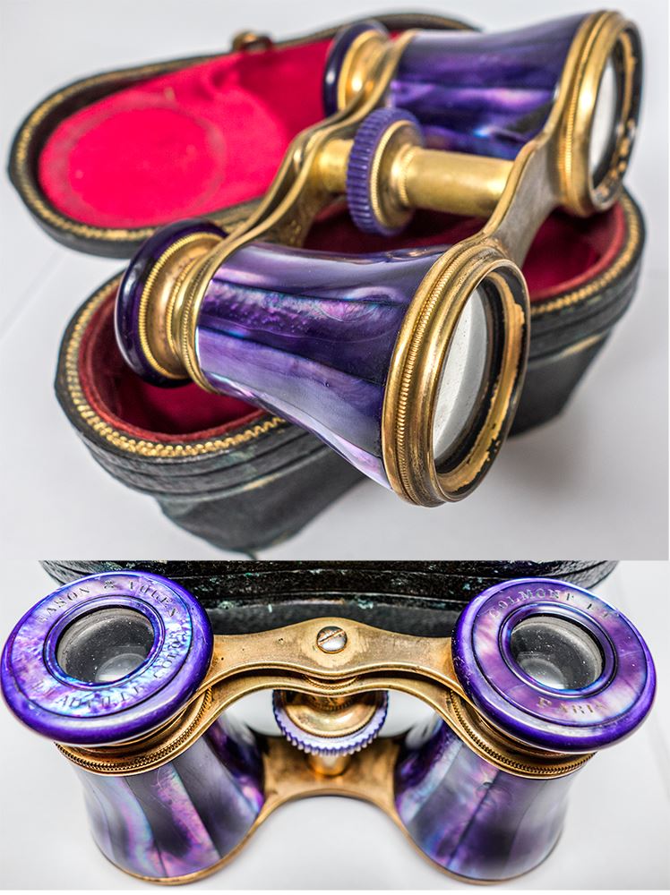 Stunning pair of vintage Colmont Ft mother of pearl, brass opera glasses. RARE color. Made in Paris by one of the finest optics companies, and hallmarked on the mother of pearl eye pieces "Colemont Ft Paris". Fabulous condition, with no damage to the mother of pearl, no cracks, rust, corrosion or damage of any kind. Works flawlessly. Includes original case. Etched with "Mason & Voges, Leadville, Colo." J. O. Nason was a watchmaker and William Voges was a jeweler.