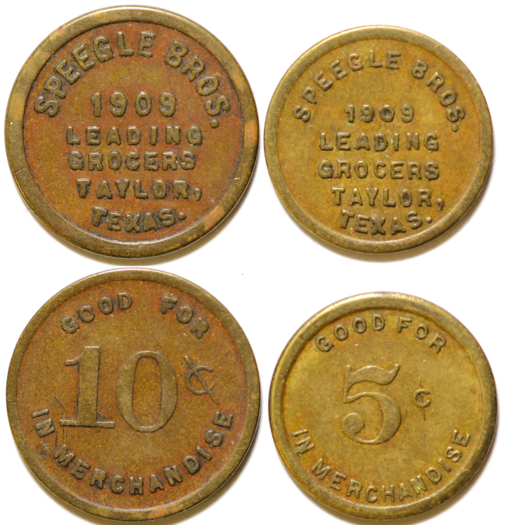 2 Pieces. Speegle Bros., Leading Grocers // GF 5c & 10c IM State: Texas City: Taylor Date: 1909 HWAC# 82659