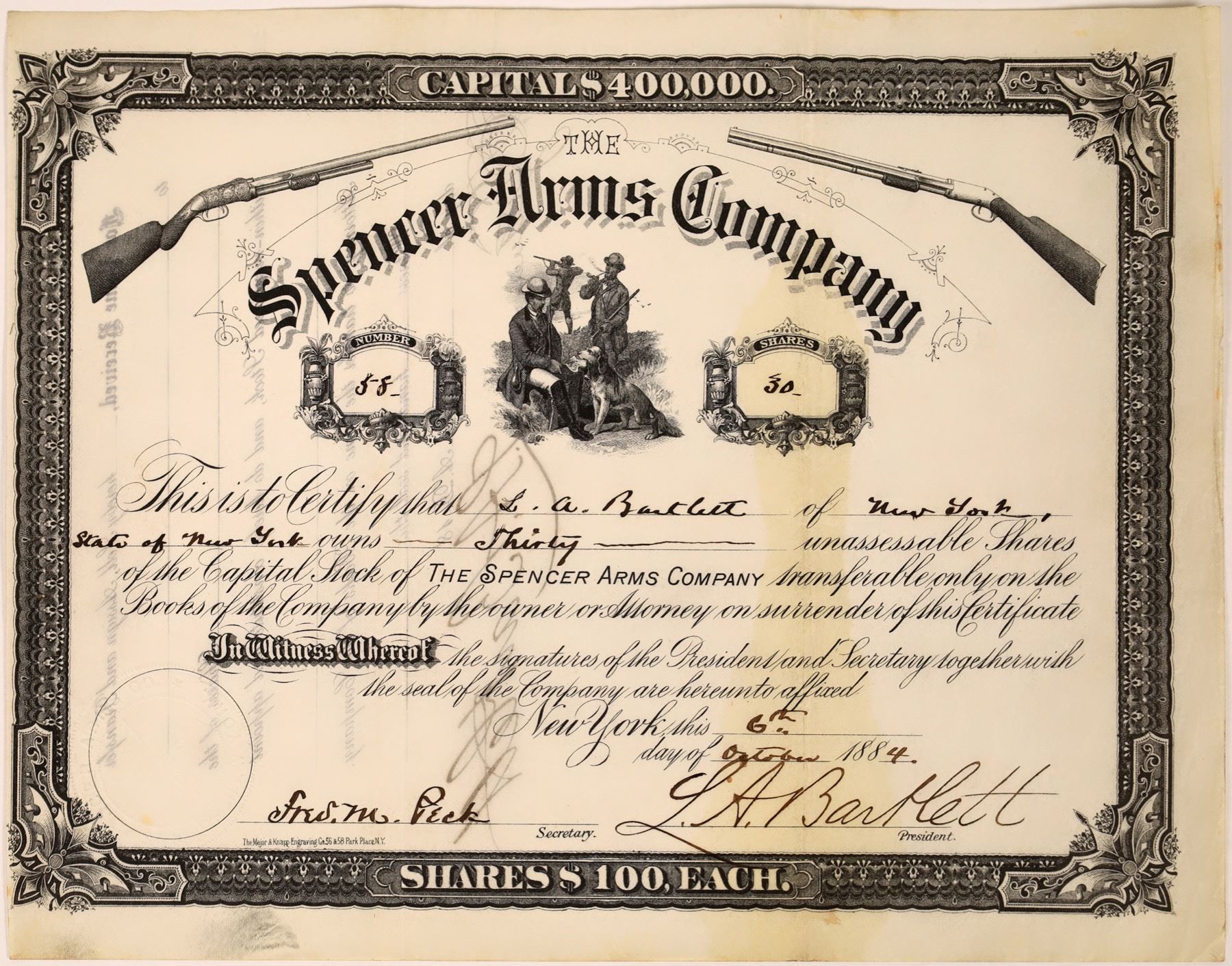 This is a single stock certificate for 30 shares of the Spencer Arms Company issued in 1884. The stock is issued to L. A. Bartlett, President of the Spencer Arms Company. Extremely rare find in stocks issued to the president himself and co-signed by the secretary Fred. M. Peck. Condition is fair with staining at the fold. A beautiful vignette of two pump action shotguns and a scene of three bird hunters in full field dress and a retriever delivering a bird. A pressed seal in the lower left corner is marked Spencer of New York with two crossed long guns. In 1882, the Spencer Arms Company ( a new company) of Windsor, Connecticut produced the Spencer Pump-Action Shotgun. This shotgun was the first commercially successful slide-action (or pump-action) shotgun. Spencer's company and patents were purchased in 1890 by Francis Bannerman & Sons of New York who continued to manufacture this shotgun until around 1907. Fred M. Peck was also be Recording Secretary of the NRA during its founding years.