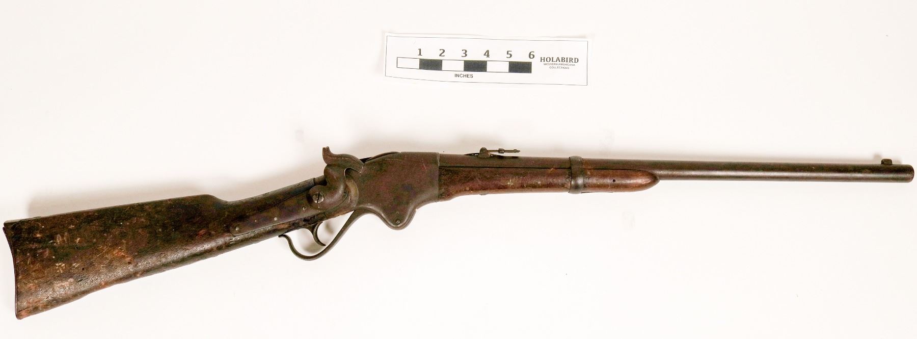 This is a Spencer Carbine in .52 cal. rimfire (56/56) model 1860, c. 1863-1865. The rifle is heavily patinated and the serial number is barely visible on the receiver. The Spencer was the earliest firearm to use a tubular feed magazine buried into the butt-stock and held 7 rounds. The feed is opened in the buttplate by rotating the cover clockwise. The barrel is 20 1/2 in. long the the gun is 39 in. OAL. The hammer is partly missing the top spur and the slide-ring is missing as well. Condition is fair. No attempt has been made to fire this firearm. No sales to New York City, New Jersey, California, or Hawaii. Additional shipping and handling fees may apply.