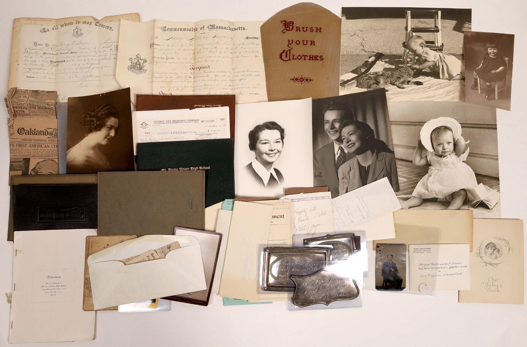 An interesting archive about 100 pieces regarding the spencer family, ending up with Guy Spencer fire chief in Walnut Creek Ca. Includes tintypes of early family including a civil war era tintype of a man in a band uniform with his horn. 3 silver memorial plaques of Spencer family that were likely attached to framed photos c1860s. Civil war discharge papers, many documents, A nice research group.