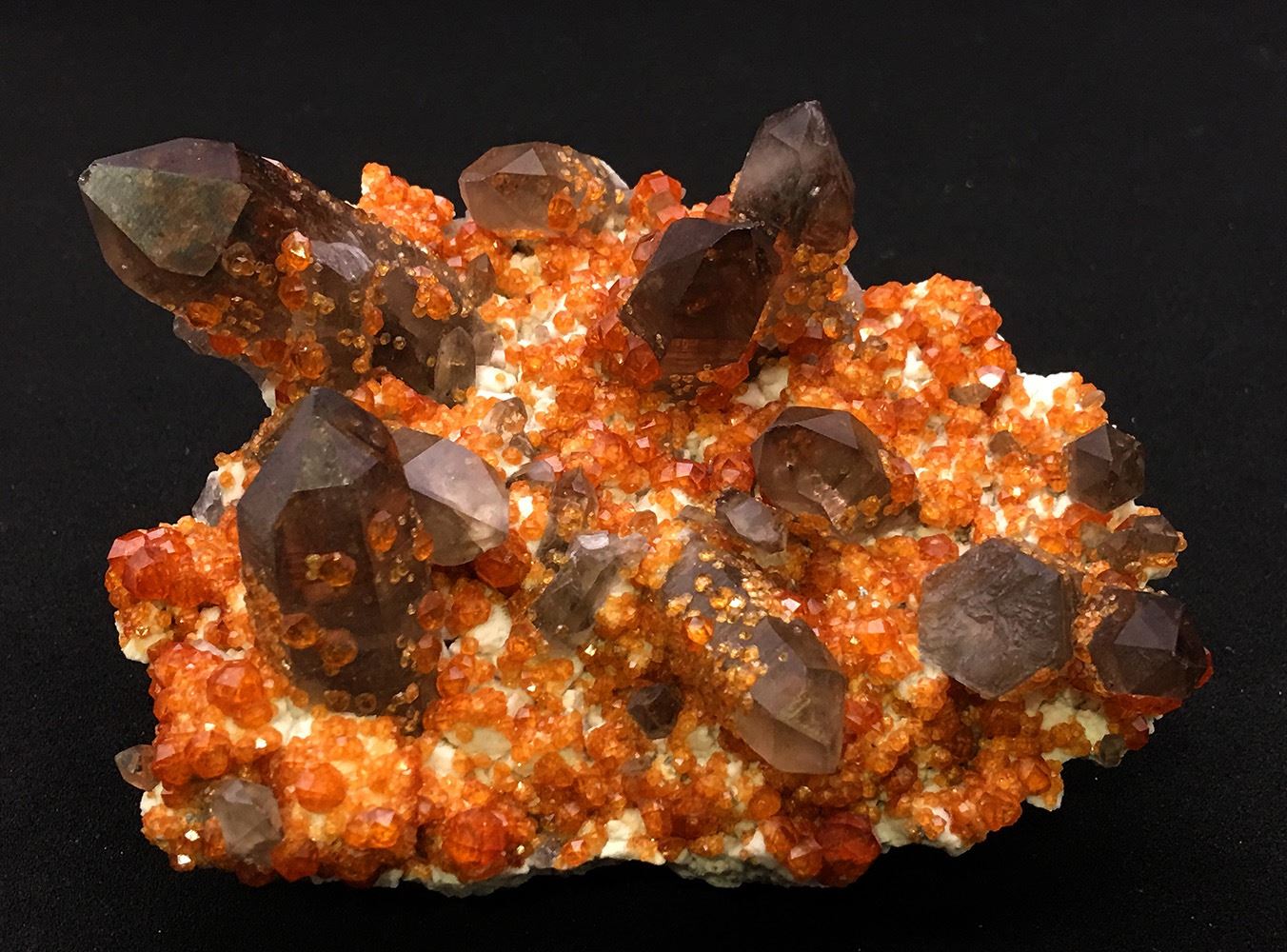 This spectacular specimen features bright orange spessartine garnets covering a matrix of off-white feldspar crystals. Rising above the spessartine covered matrix rock are approximately a dozen well-formed, medium gray-brown smoky quartz crystals. Interestingly, the orange spessartines have crystallized upon the prism faces of the smoky quartz crystals as well, delivering a color contrast-rich combination specimen. The spessartine-smoky quartz combo specimens from this locality have established a new worldwide standard for aesthetics in garnet specimens. The first specimens of Chinese spessartine garnets associated with smoky quartz and feldspar appeared on the market in 1998. Specimen collecting at this locality has been prohibited by government officials for several years now and the worldwide availability of these incredible Chinese spessartine/smoky quartz specimens has declined dramatically. Dimensions (cm): 4.7 H x 11 W x 9 D. Location: Wushan Spessartine Mine, Tongbei, Yunxiao Co., Zhangzhou Prefecture, Fujian Province, China City: State: China Date: HWAC# 53018