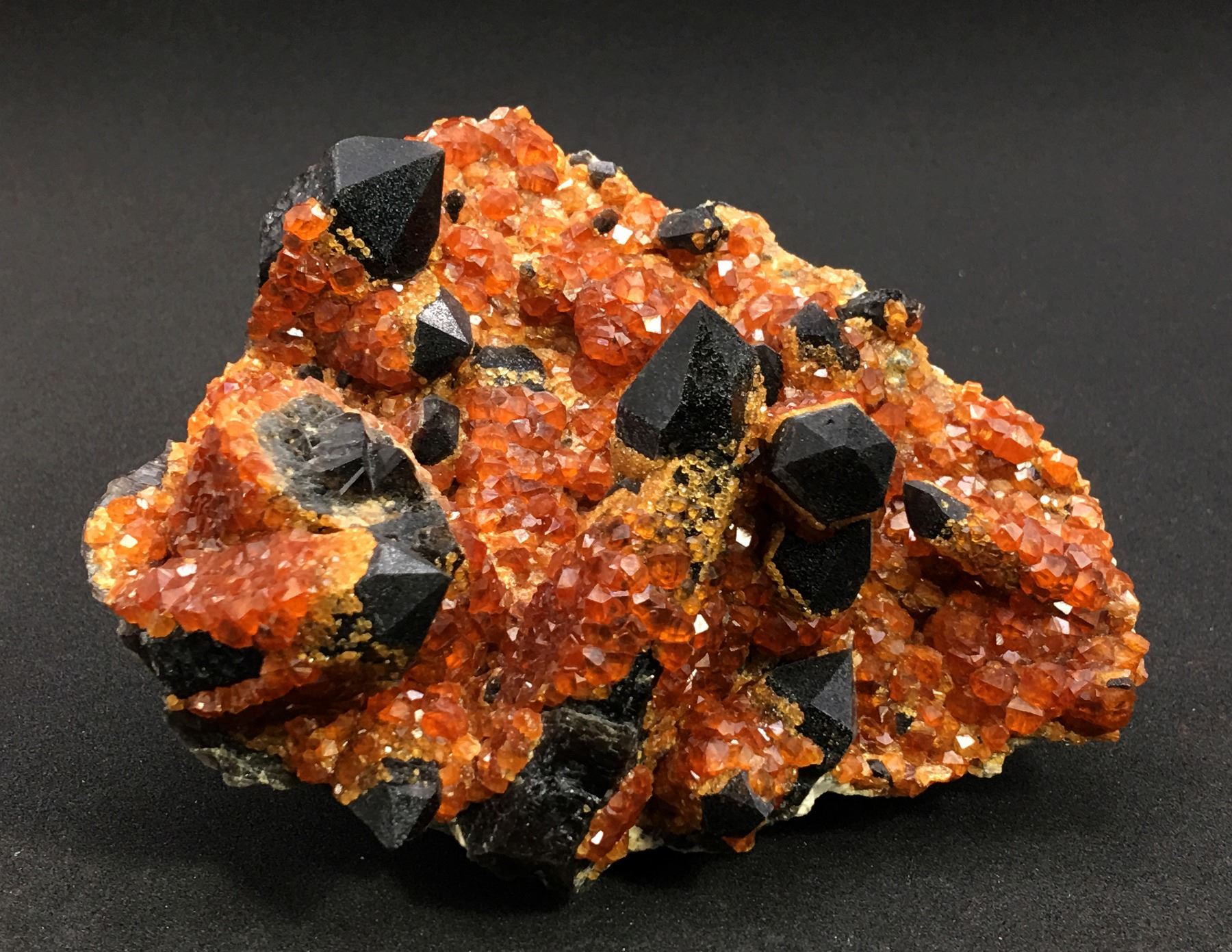 A fantastic specimen featuring Spessartine (garnet) and Smoky Quartz crystals. Spessartine is a nesosilicate, manganese aluminium garnet. Spessartine forms a solid solution series with the garnet species Almandine. Spessartine, like the other garnet species, always occurs as a "blend" with other species. Crystals with high Spessartine content tend toward a light orange hue, while Almandine prevalence induces red or brownish hues. Orange Spessartine garnets most frequently occur in sodium-rich, granitic pegmatites. The deposit at Tongbei, Fujian Province, China is a essentially a large exposed "dome" of granite. The Spessartine crystals line the interiors of small, discreet pockets within the granitic mass and occur as fracture fillings within the granite. This specimen features a continuous "carpet" of bright orange, highly lustrous, trapezohedral Spessartine crystals in association with black Smoky Quartz crystals. Dimensions (cm): 5.5 H x 12 W x 10 D. Location: Wushan Spessartine Mine, Tongbei, Yunxiao Co., Zhangzhou Prefecture, Fujian Province, China City: State: China Date: