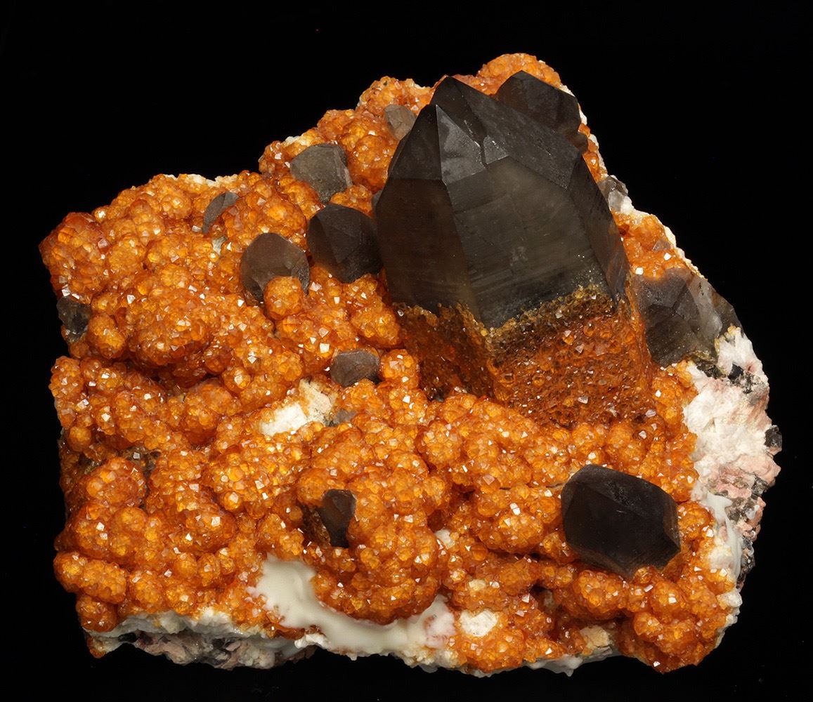 A superb, collector-quality specimen of bright orange spessartine garnet crystals associated with one large and several smaller smoky quartz crystals. Dimensions (cm): 11 H x 11 W x 5.7 D. Location: Wushan Spessartine Mine, Tongbei, Yunxiao Co., Zhangzhou Prefecture, Fujian Province, China City: State: China Date: HWAC# 53065
