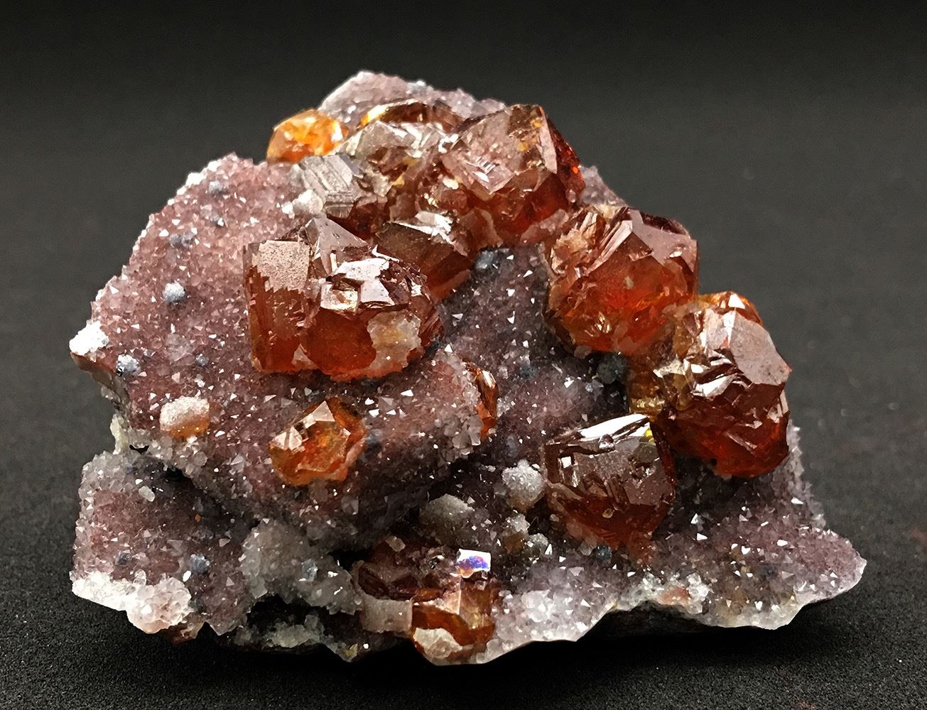 This specimen features more than ten gemmy, lustrous, sharp, reddish-orange sphalerite crystals which have grown on a matrix covered with colorless druzy quartz crystals and associated with white calcite and metallic-gray crystals of galena. The condition of the specimen is excellent and the overall aesthetics are superb. The Shuikoushan Mine is a skarn-type copper-lead-zinc deposit, occurring in the contact zone of the Shuikoushan granodiorite lopolith with Carboniferous and Permian carbonatites. Dimensions (cm): 3.4 H x 7 W x 7 D. Location: Shuikoushan Pb-Zn-Cu Deposit, Hengyang Prefecture, Hunan Province, China City: State: China Date: HWAC# 53054