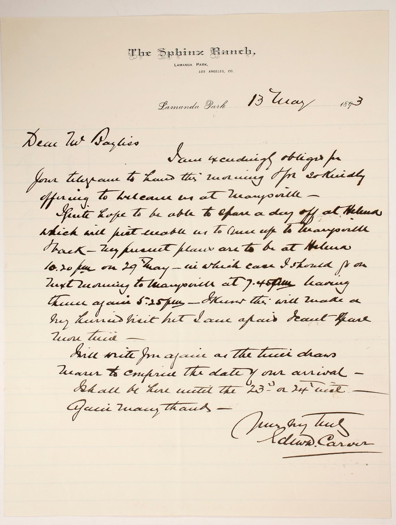 Very rare Sphinx Ranch. Lamanda Park, CA letterhead signed by Edward Carver.