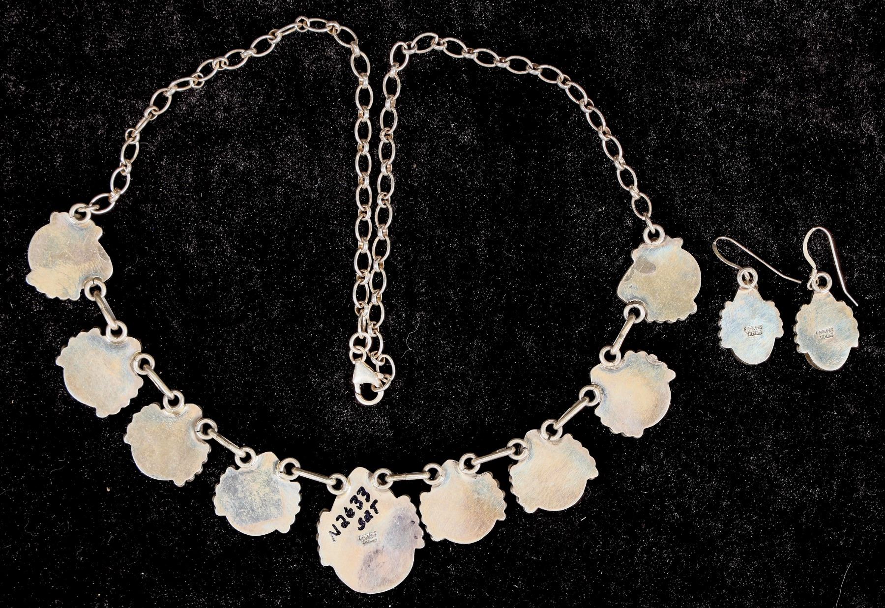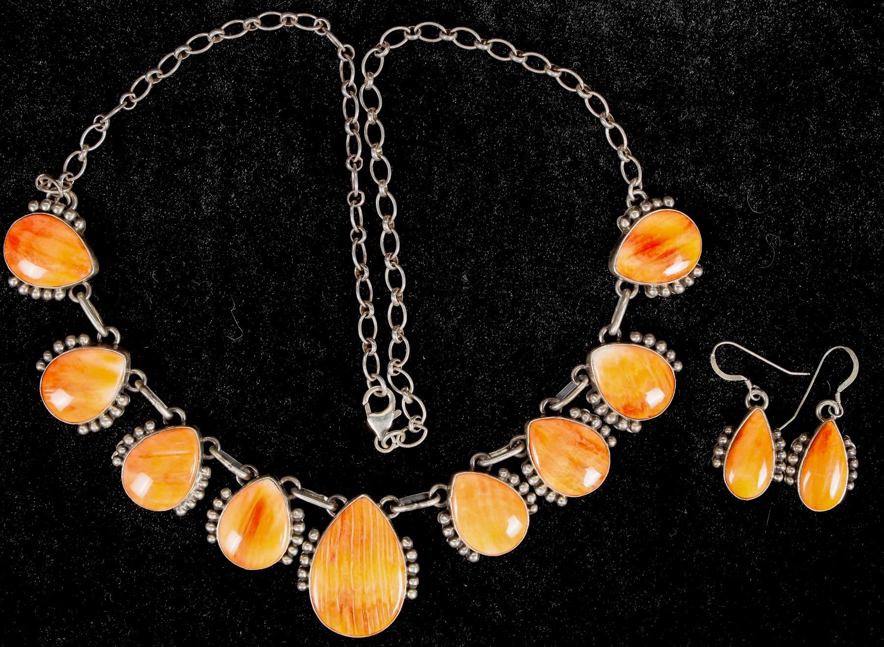 This is a beautiful Navajo made orange spiny oyster necklace with matching earrings, necklace measures 12" top to bottom, this is a very attractive set and is signed E. Richards.