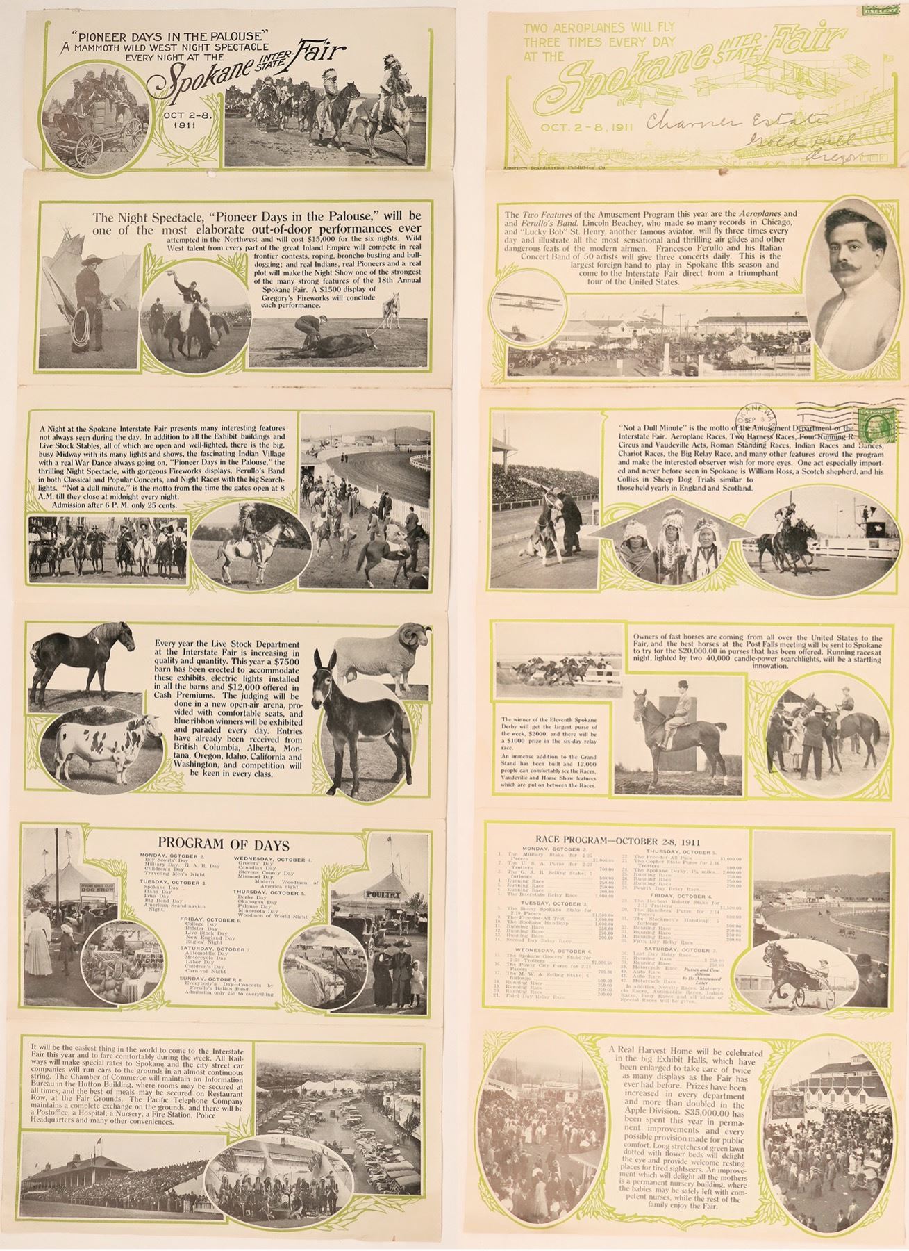 This is a mailed program for the 1911 Spokane Inter-State Fair featuring a Wild West show and three fly-bys of aeroplanes. Mailed to the CHanner Estate of Gold Hill, Oregon with cancelled postage stamp. 8.5 in. X 11 in.