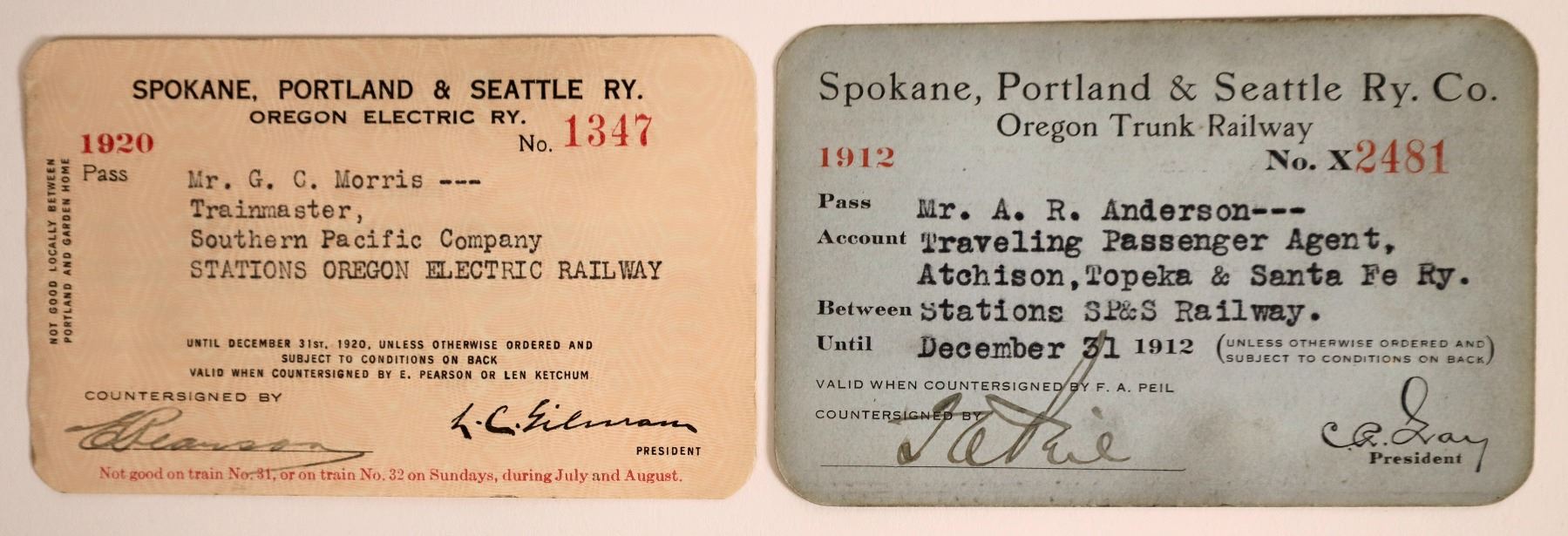 Lot of 2 different. This was a joint venture by the Great Northern Railway and the Northern Pacific Railway to build a railroad along the north bank of the Columbia River. Remnants of the line are currently operated by BNSF Railway and the Portland and Western Railroad. 1) 1912 pass to AR Anderson of ATSF. Also lists "Oregon Trunk Railway." Preprinted president signature, countersigned by Peil. Endorsed by Anderson. Black print on blue cardstock. 2) 1920 pass issued to GC Morris, Southern Pacific. Also lists "Oregon Electric Railway."