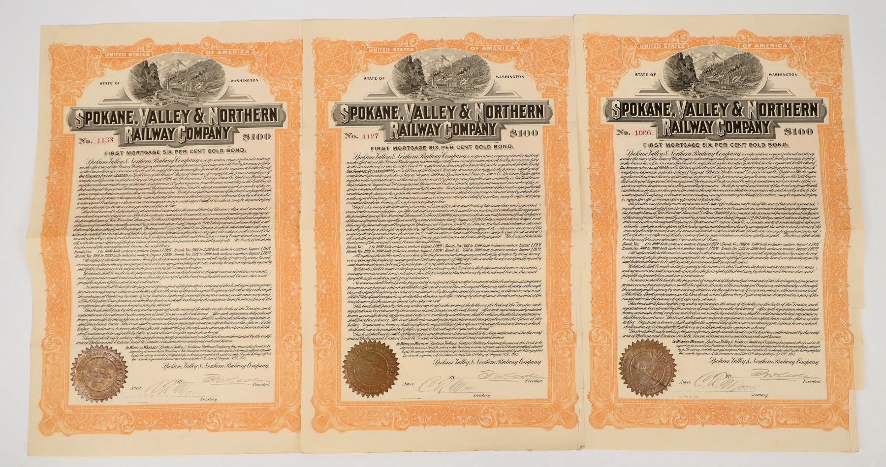 Lot of 3. I/U. Issued 1917. EF cond. Spokane, Valley & Northern Railway Co., $100, 6% gold bearer bond.. Cole Litho Co. printer.