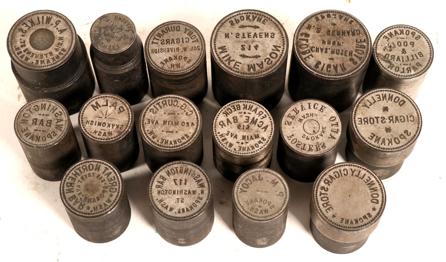 Sixteen different dies, various sizes from Spokane, Washington. From the Northwest Territorial Mint Historical Die Collection.
