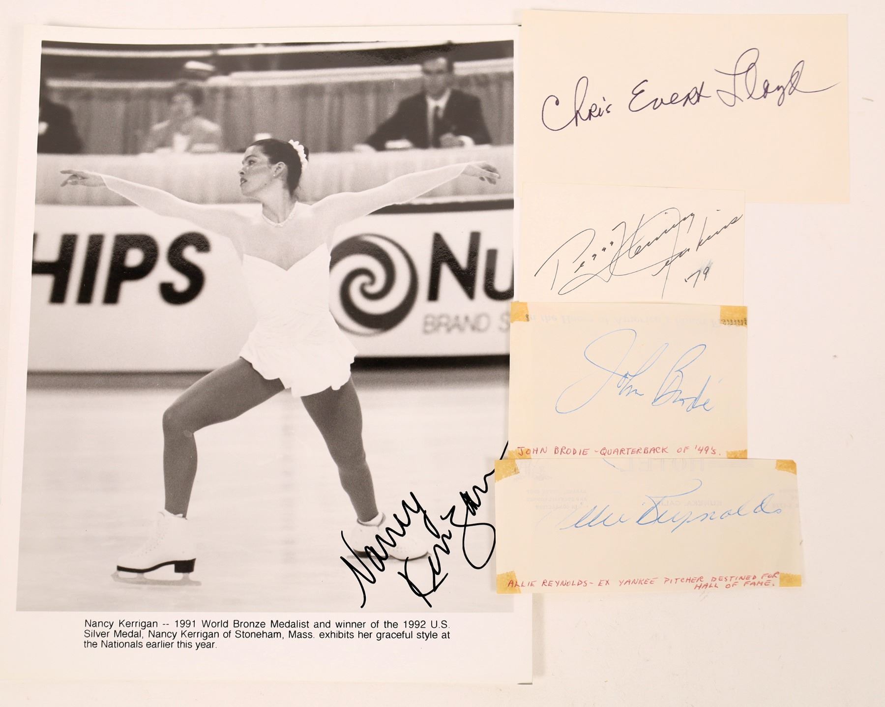 Sports legends are celebrated in this lot that includes New York Yankee pitcher, Allie Reynolds (1917-1994), San Francisco 49er quarterback John Brodie, Wimbledon champion tennis great Chris Everett Lloyd, U.S. Open Golf Champion, Julius Boros (1920-1994), and champion figure skaters Nancy Kerrigan and Peggy Fleming. All signatures are clear. Please see photos for more detail and condition. State:California City: Date:1940's-1980's Provenance: Salvatore Falcone Collection