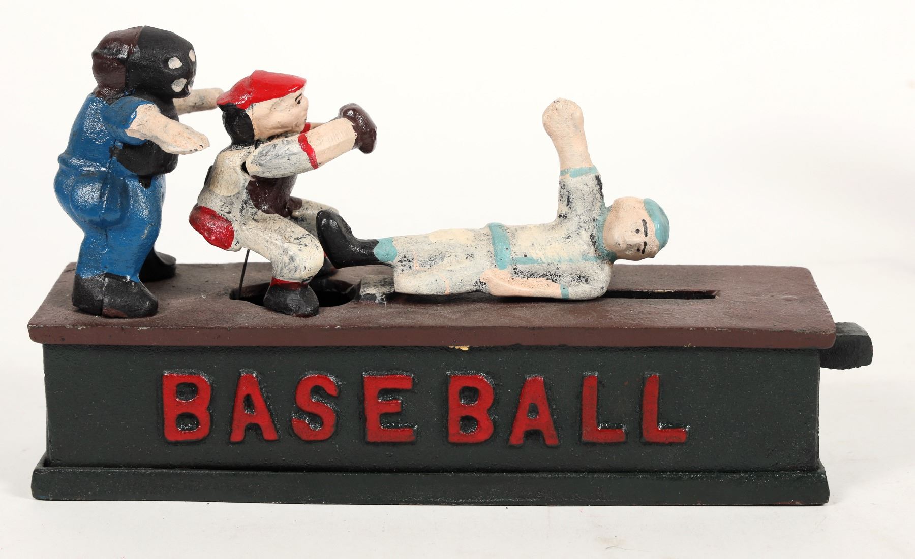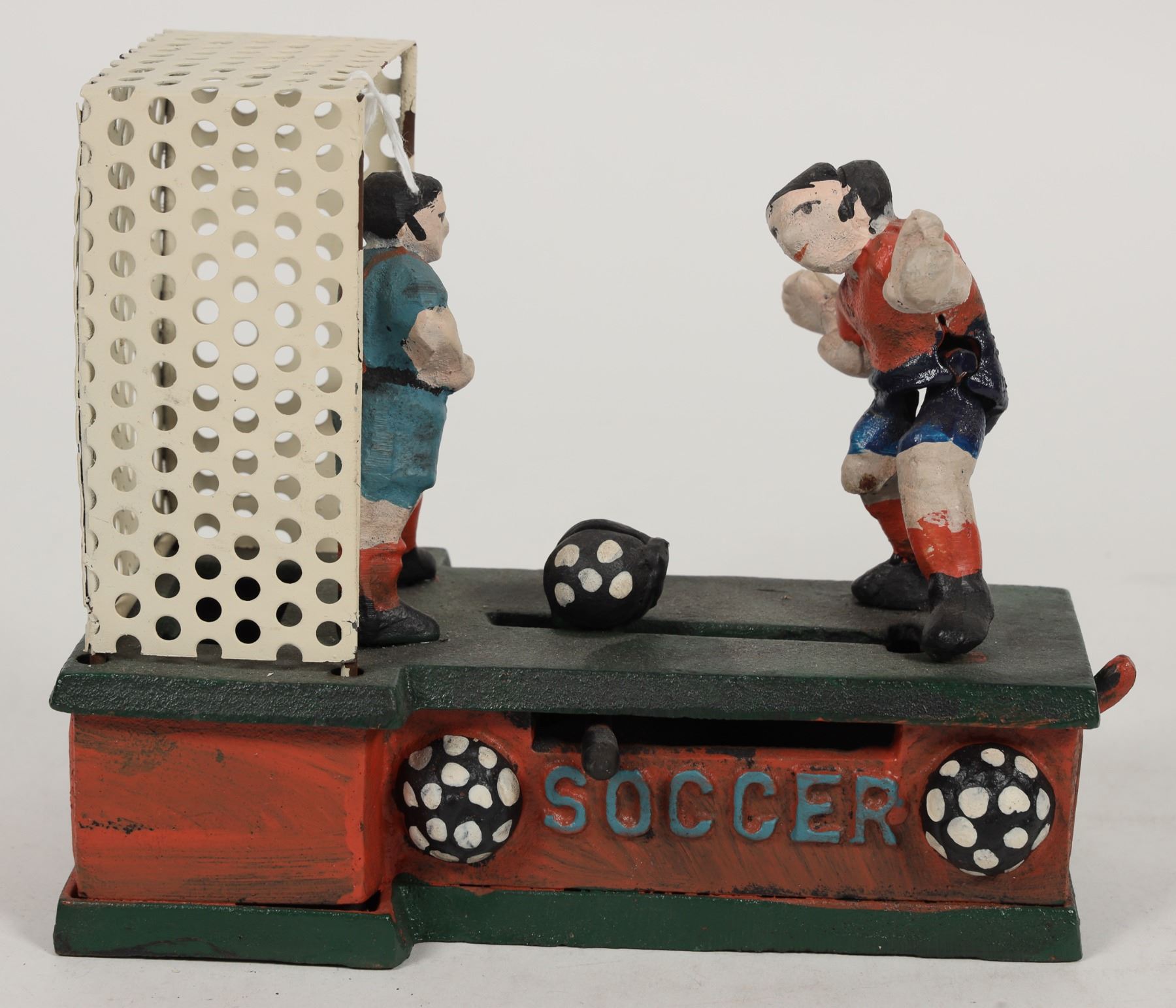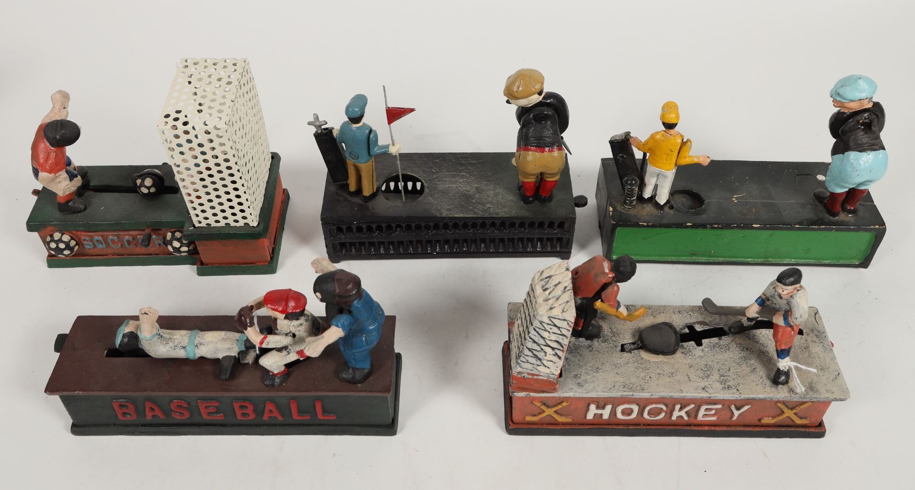 Lot of 5. Sports Cast Iron Coin Banks ,1950 reproductions. There is Baseball, Soccer, Golf (2), Hockey These were probably manufactured in Taiwan, there are no markings by manufacturer. They are complete, will need cleaning.