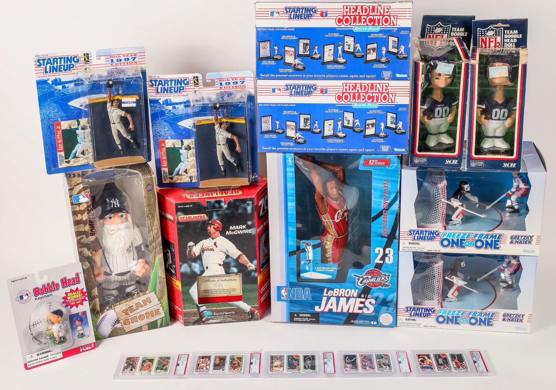 Sports figures and items aplenty, including Starting Lineup figures from baseball, basketball and hockey. There's a Mark McGwire figure commemorating his 70 homer season, a LaBron James action figure, a Yankee gnome and much more. Most are new in box. Please see photos for more details. 1990s