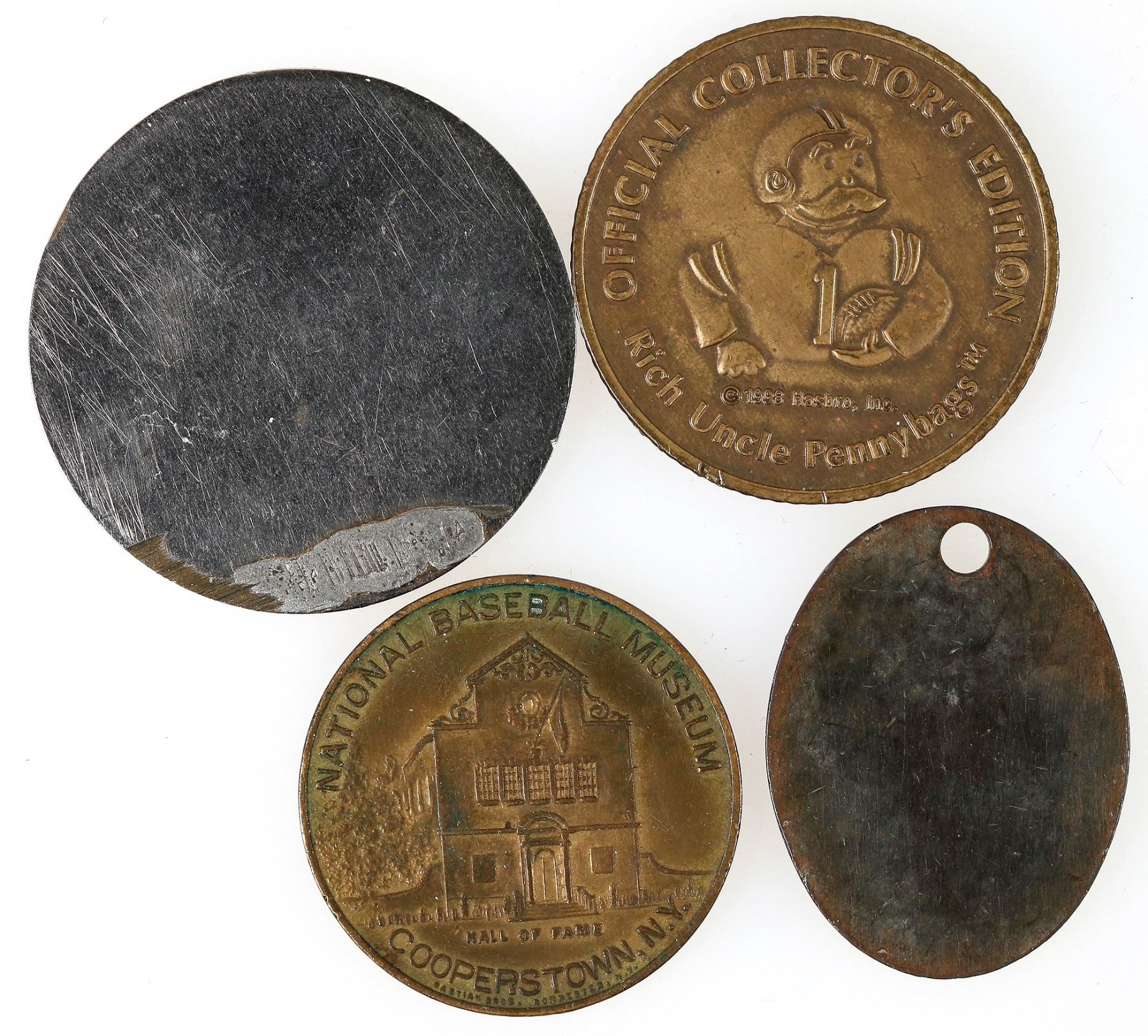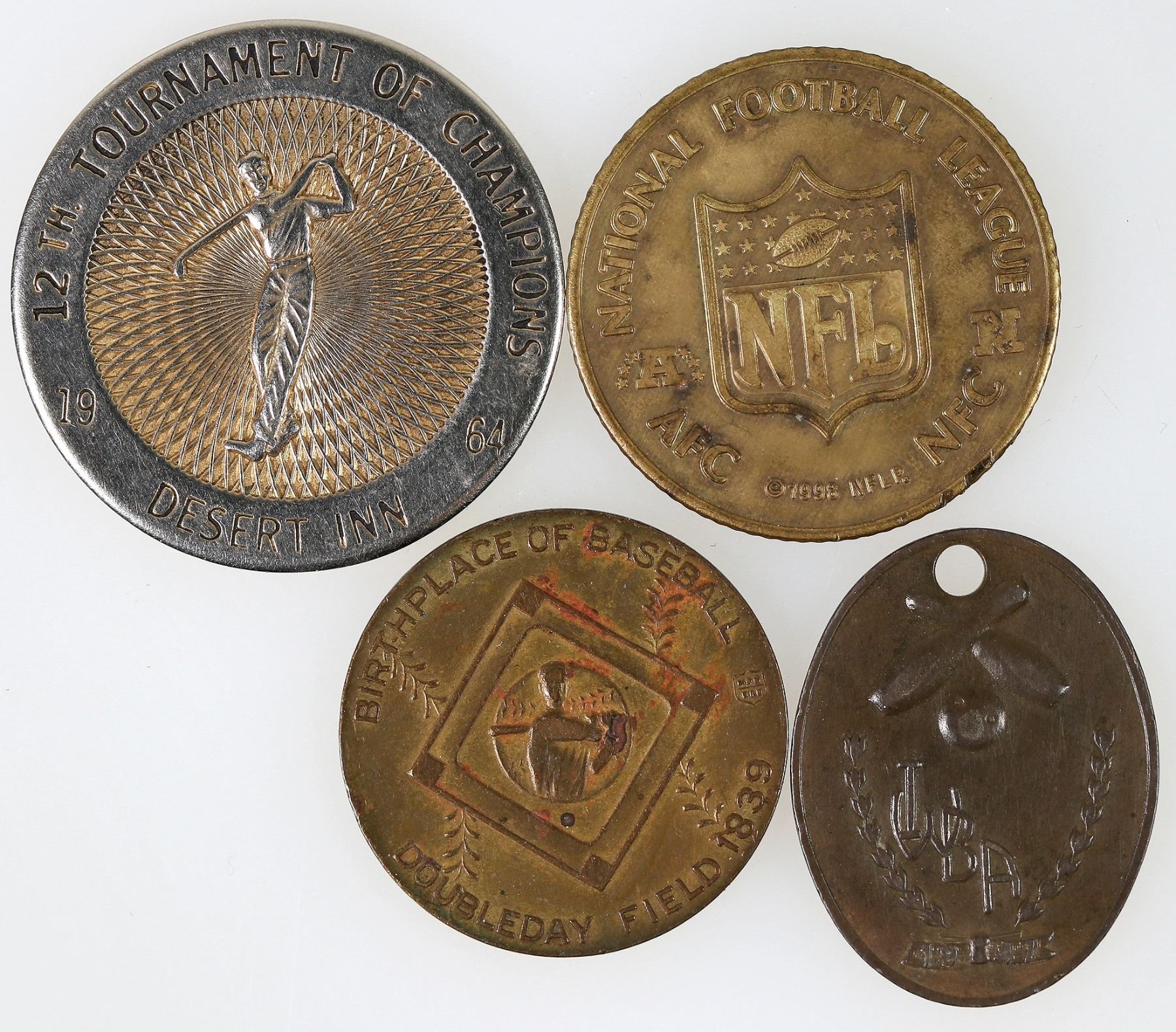Lot of four sports medals: 1) 12th Tournament of Champions Desert Inn 1964; 2) 1998 NFL Official Collectors Edition Rich Uncle Pennybags; 3) Caliente Mexico dollar token, 1968 Olympics; 4) National Baseball Museum, Cooperstown, New York; Birthplace of Baseball, Doubleday Field, 1839.