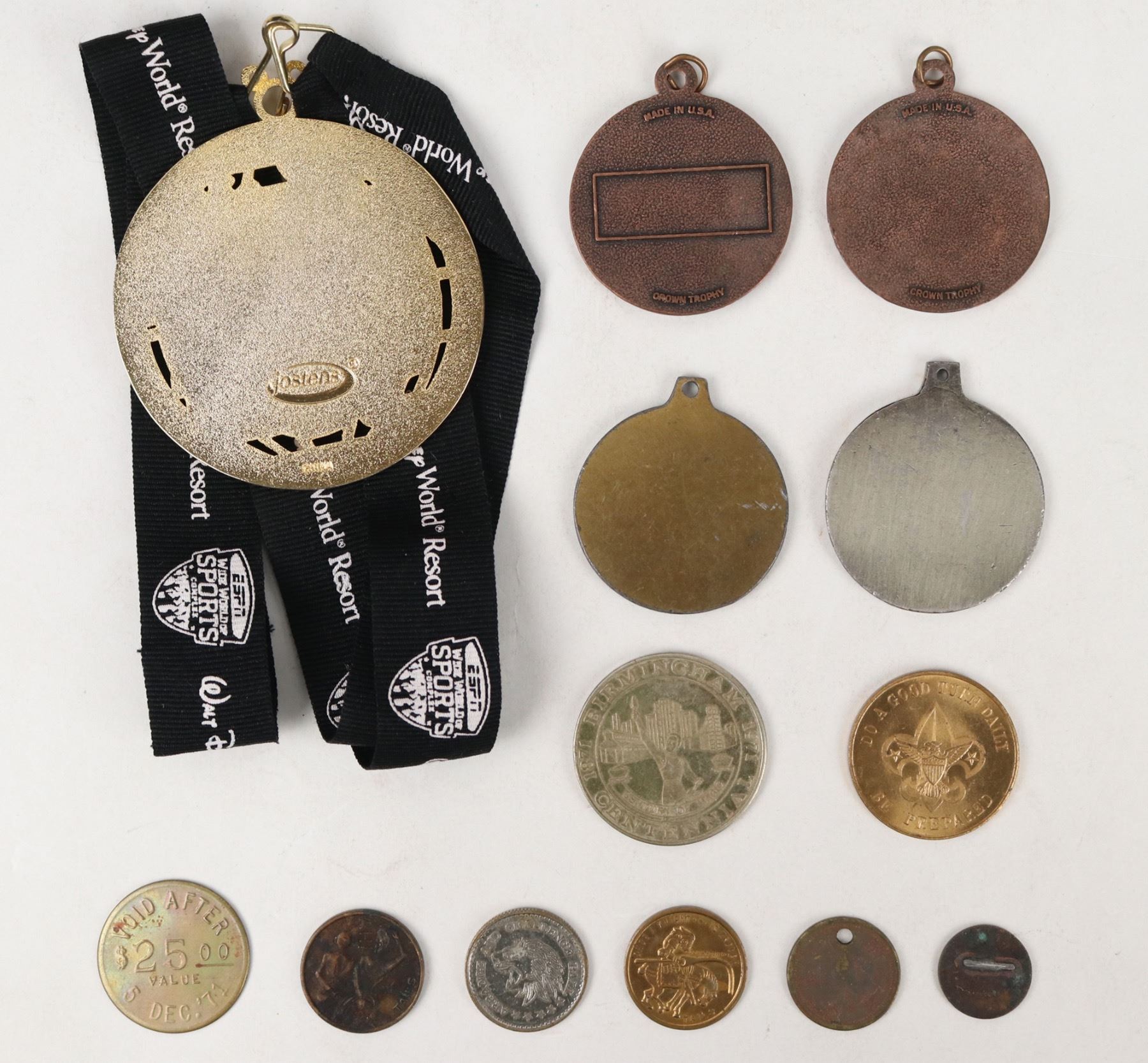 Group of 13 medals and commemorative coins from sporting events. Varying condition; see photos.
