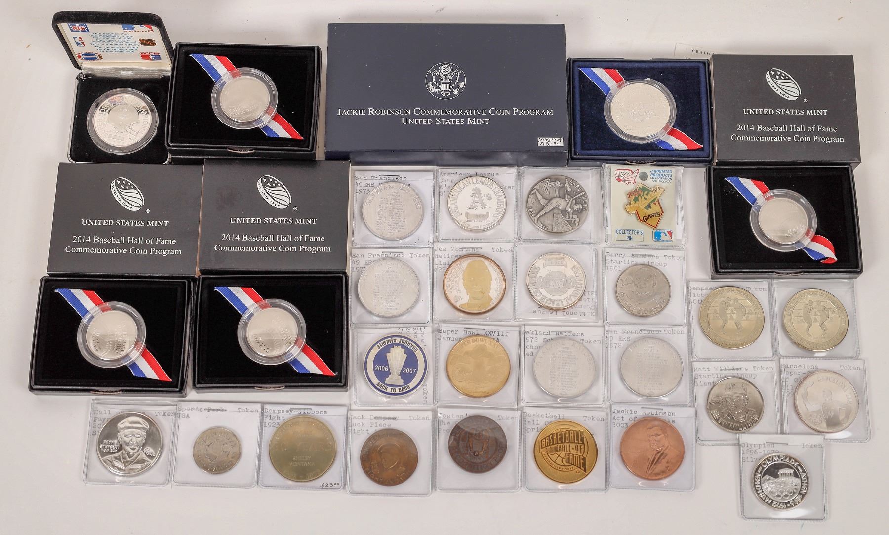 United States Mint 2014 Baseball Hall of Fame Commemorative Coin clad proof half dollars (4); 1997 Jackie Robinson 50th Anniversary Uncirculated silver dollar issued by the U. S. Mint; 1995 one ounce silver medallion of Super Bowl XXIX Champion San Francisco 49ers; six silver medals: 1972 Olympics; Payne Stewart; Joe Montana; 1992 Barcelona; 1989 Oakland A's American League Champions; 1989 S. F. Giants National League Champions; 18 other sports medals: Babe Ruth, Matt Williams, Dempsey fights, Super Bowls, Barry Sanders and more.