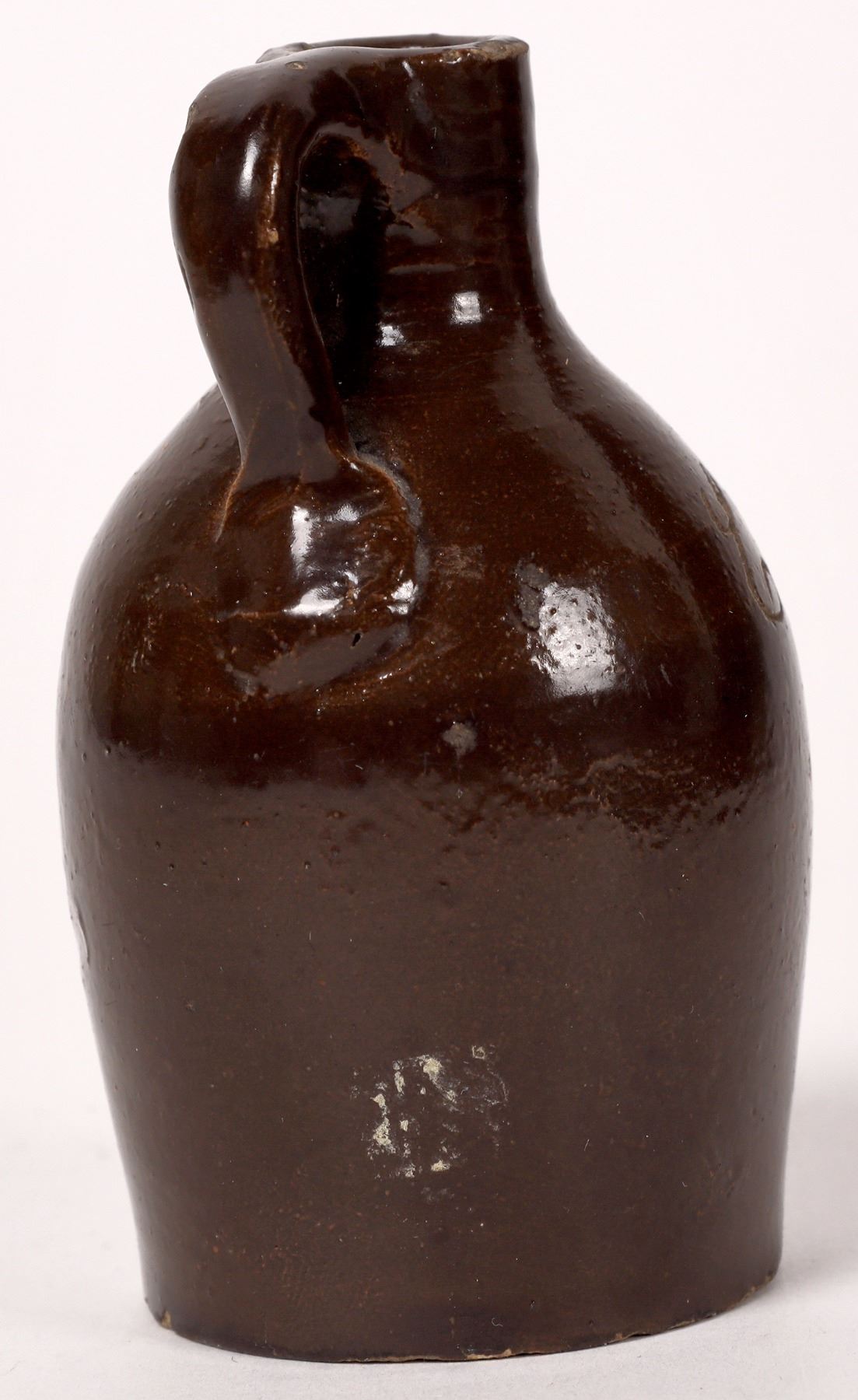 Brown scratch engraved mini jug. Compliments of/Spot Cash Grocery/Joplin Mo. 3.25". Small handle, lip and base chips.