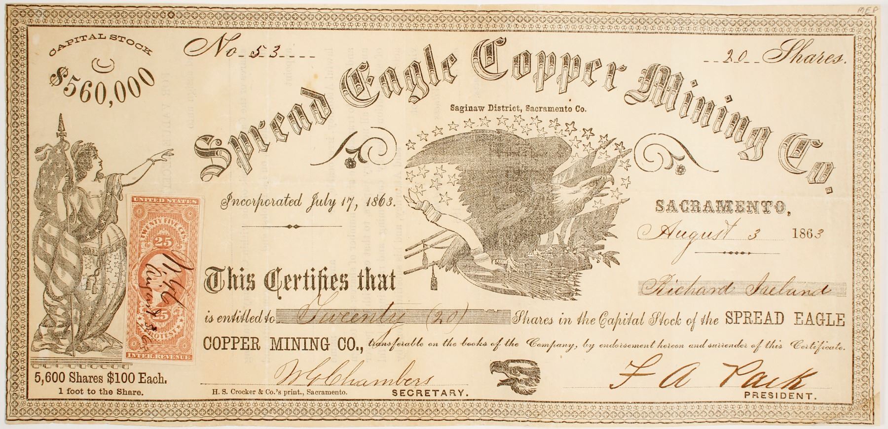 Saginaw District, Sacramento Co. (printed under logo). Inc. July 17, 1863. Dateline Sacramento, August 3, 1863. No. 53, issued for 20 shares to Richard Ireland. Signed by the president, FA Park, and secretary Chambers. Not cancelled. Patriotic vignettes of an eagle and a flag-draped woman. Printed by H.S. Crocker & Co., Sacramento. Folds, creases corner, heavy toning. Not in Filer. We could not easily locate more information about this company or the Saginaw District of Sacramento County. We could find reference to a Spread Eagle copper mine in Shasta County: "Twenty-two unpatented claims in Sec. 13, T. 33, N., R. 6 W ; owned by W. C. Onn & Sons, of Copley. About 1500 feet of tunnels, mainly driven by the Scottish American Syndicate, of Denver, Col., under bond, show considerable bodies of ore, including some of excellent grade. The country rock is heavily charged with sulphides." [Ref: The Copper Resources of California, Aubury, 1902]
