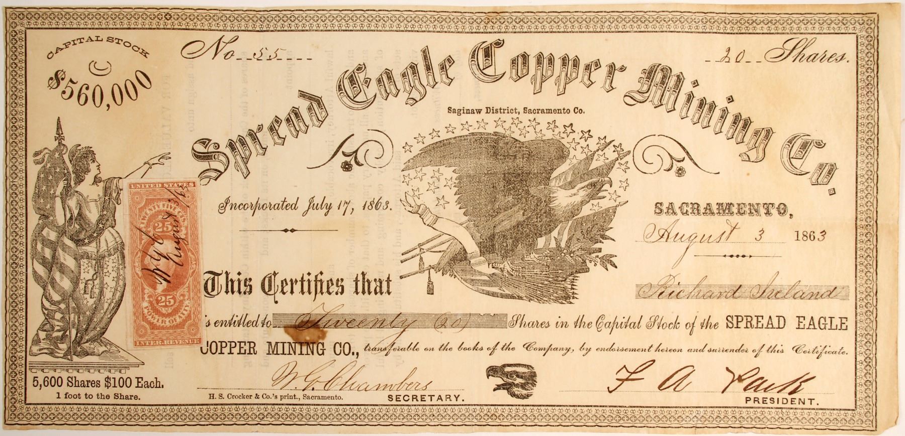 # 55 for 20 shares to Richard Ireland. Datelined Sacramento 1863. Signed by secretary Chambers and president FA Park. Incorporated July 17, 1863. Uncancelled, Printed by HS Crocker. 25c Power of Atty Revenue stamp. Not in Filer. Eagle vignette with wings spread! Located in Saginaw Mining District, Sacramento County. The object of the mine was to work certain mining grounds on the Spanish lead in the Saginaw Mining District. [Sacramento Daily Union, July 18, 1863] Prag Collection