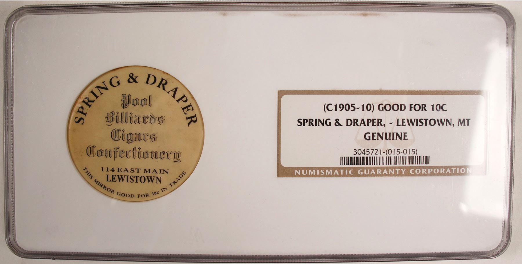 Spring & Draper/ Pool/ Billiards/ Cigars/ Confectionery/ 114 East Main/ Lewistown. This mirror good for 10c in trade. NGC holder 3045721-015-015. Date: Location: Lewistown, Montana HWAC# 56011