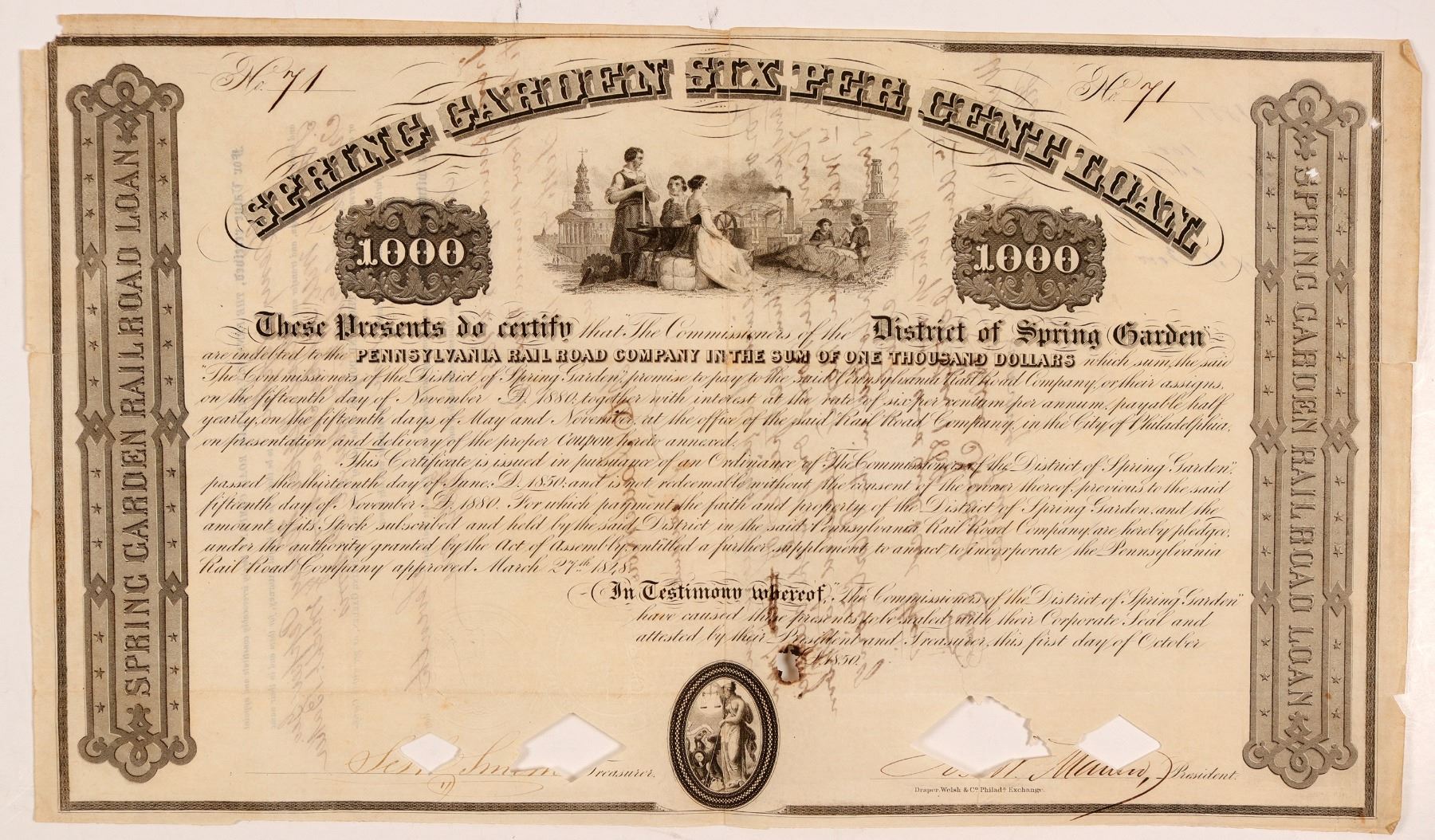 #71, I/C, $1000 6% Loan Due Nov. 15, 1880. Issued Oct. 1, 1850 to Pennsylvania Railroad Co.. Signatures are cut out. This is a loan by the railroad to the District of Spring Garden. BLACK, two embossed seals: one form Spring Garden and the other by the railroad (4-4-0 center). Vignettes: bottom Lady Justice, top allegorical females. SPRING GARDEN RAILROAD LOAN down both sides, printed on india paper. Draper, Welsh, & Co printer. VF.