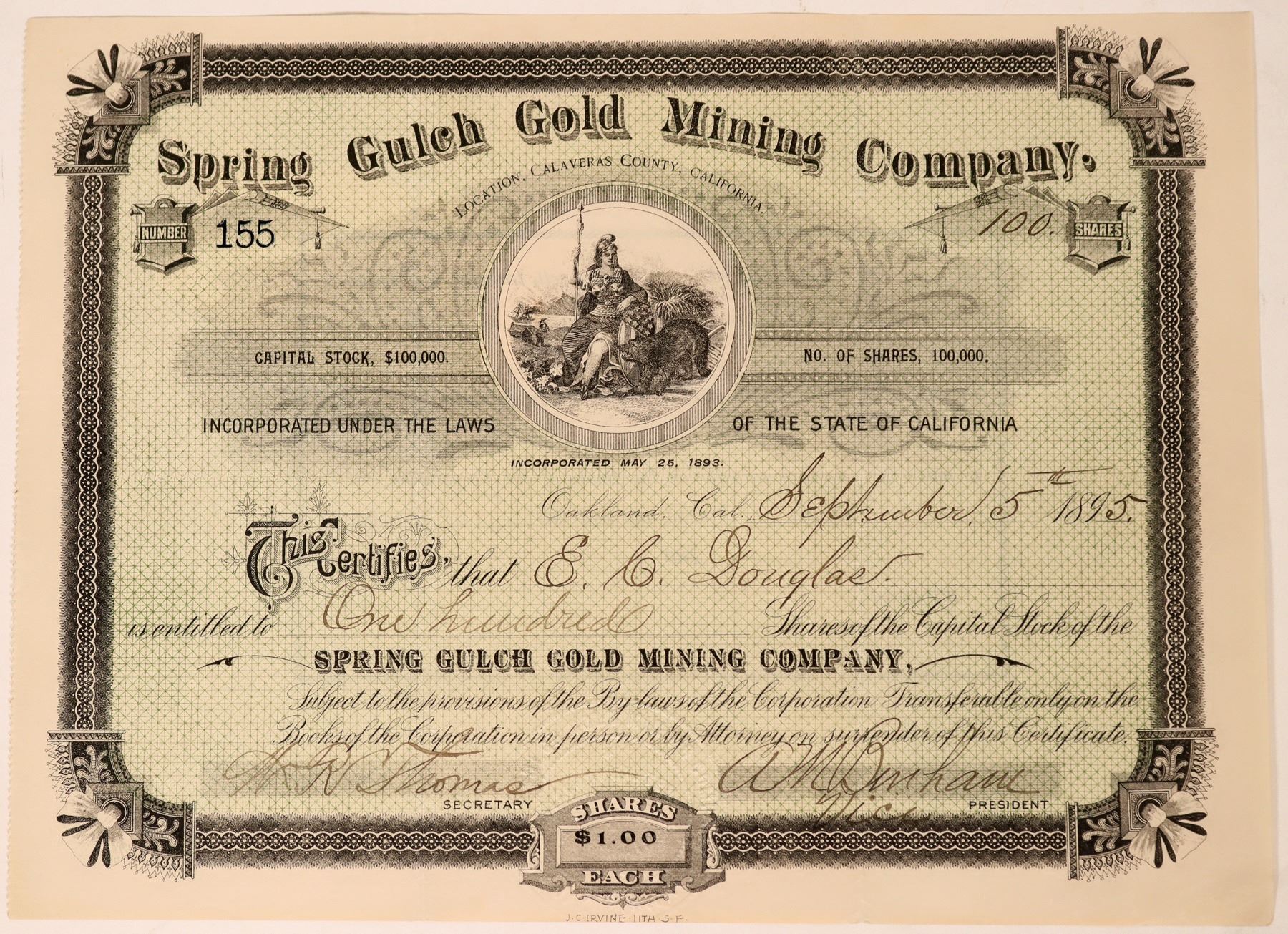 The Spring Gulch mine was located near San Andreas, California in the Mokelumne Hill Mining District. The company was a small producer. The ore produced was gold with waste material primarily made up of quartz (thediggings.com). Certificate is in very good condition and is uncanceled.