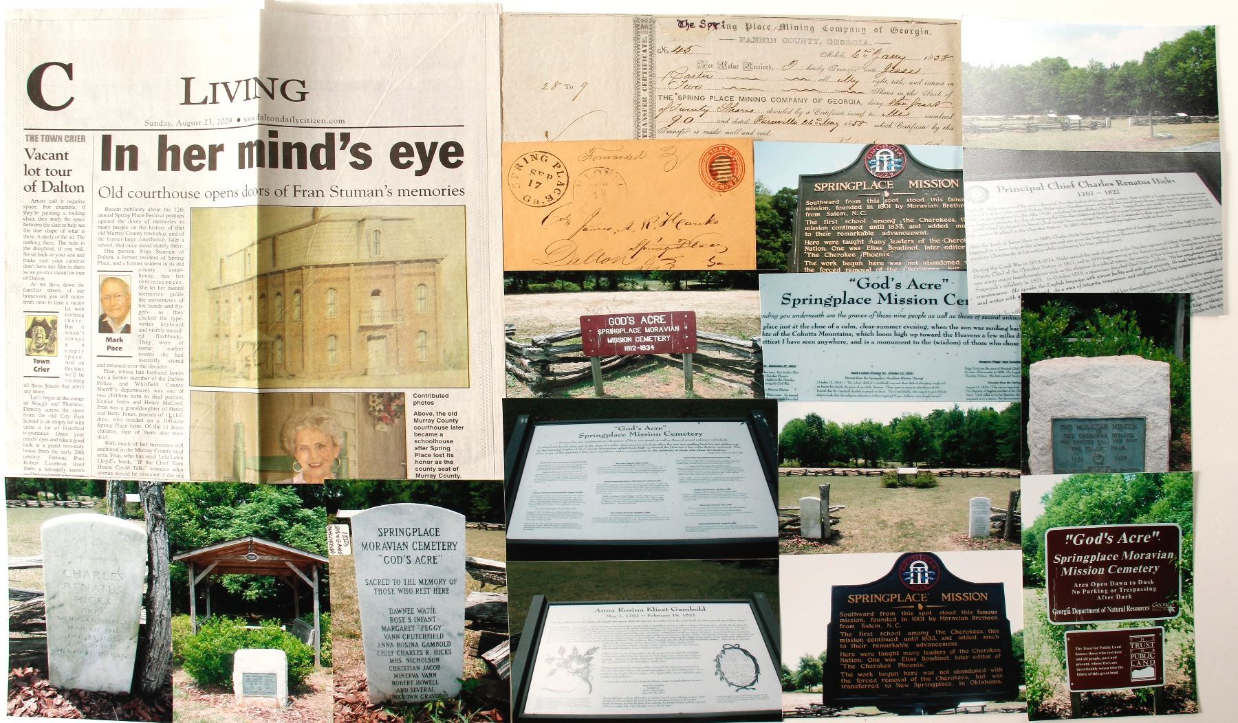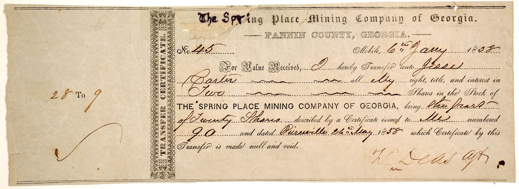 Very early 1858 stock certificate transfer for the Spring Place Mining Company of Georgia. Number 45 to Jesse Carter for two shares. From agent LC Deas. 3.5 x 10". The "THE SPR' has been written over at some point in this stock transfer's life. A large tear had destroyed these letters. Some holes, Edges are strong. The Spring Place Mining Company was formed in 1854. [Acts Passed by the General Assembly of Georgia] Along with the Tocoah, the Spring Place Mining Company was the first in Murray County. [Murray County Museum online] Includes an envelope was addressed to Colonel James A R Hanks at Spring Place. He was the assistant quartermaster. It was forwarded to Dalton Georgia and hence a very strong Spring Place cancel is found in the upper left. Hanks served on the staff of the 22nd Georgia and was discharged for disability on June 1862. Spring Place was the home of a famous Cherokee Mission which was founded in 1801. Includes several pieces of background information on Spring Place. (Al Adams Gold Rush Memorabilia Collection) Date: 1858 Location: Spring Place, Georgia HWAC# 56938