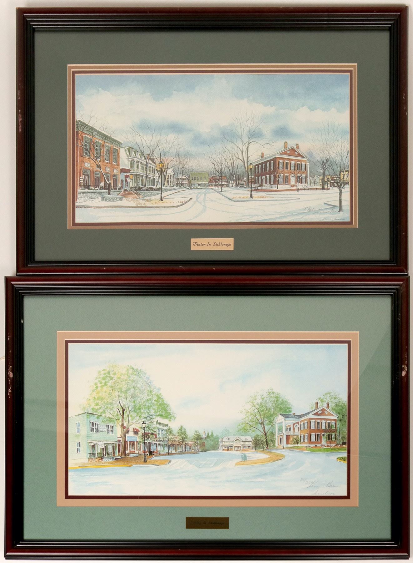 Nice prints on watercolor paper. Framed and matted prints signed by Loraine Brewer marked 85/250, dated 12/19/1999. Frame of Spring in Dahlonega is 19" x 29" the print is 11.75" x 21.25"; The framed Winter in Dahlonega is 19" x 27.75" the print is 11" x 20.5". Frames are slightly marred on left side of both frames and small scratches on the right side of both frames. Prints,matting and glass are in excellent condition.