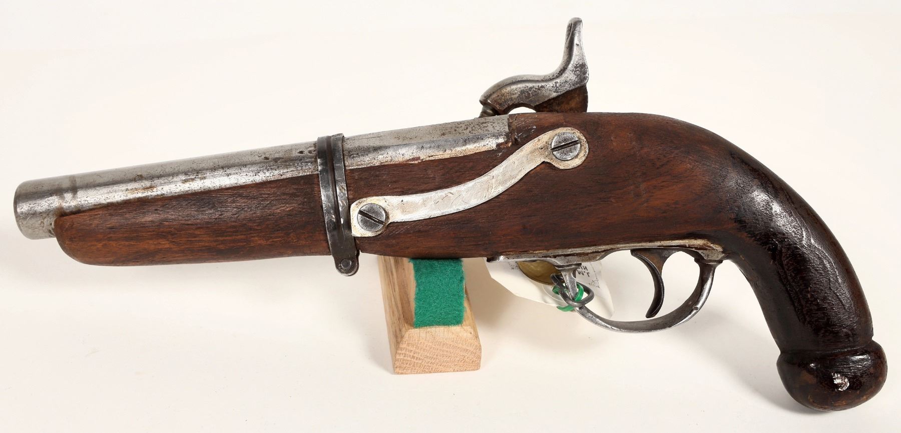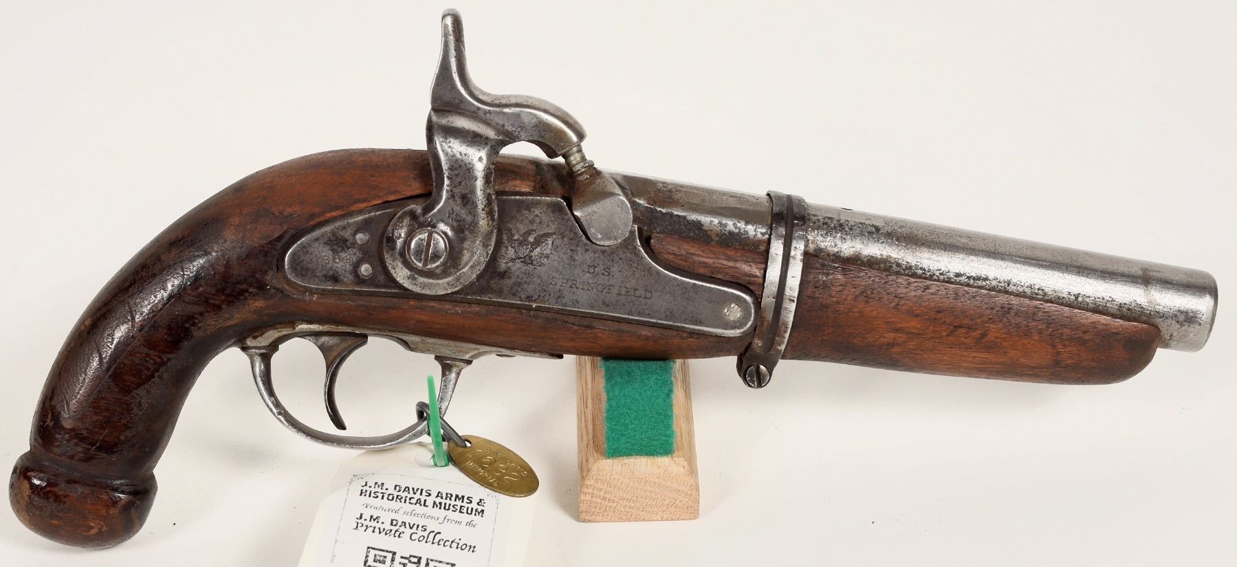 This is a Springfield percussion single shot pistol dated on the lock at 1864. 62 caliber percussion ignition, a marriage of parts. Providence is from the JM Davis Arms Museum tag # 1632. No FFL required. Please see photo for details.