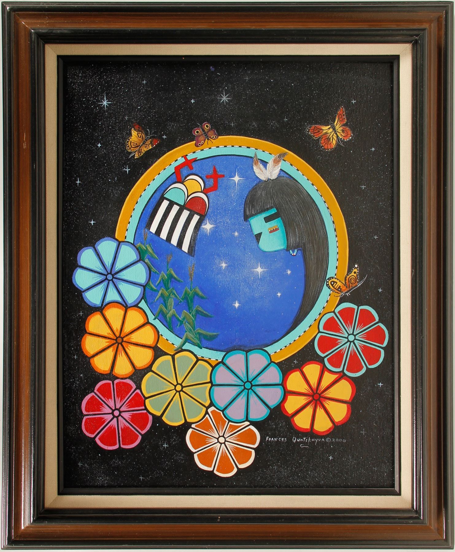 by Frances Quotskuva, of the Hopi Bear Strap Clan. 2nd Place winner Hopi Market 2006. Frame is 19 x 23 inches.