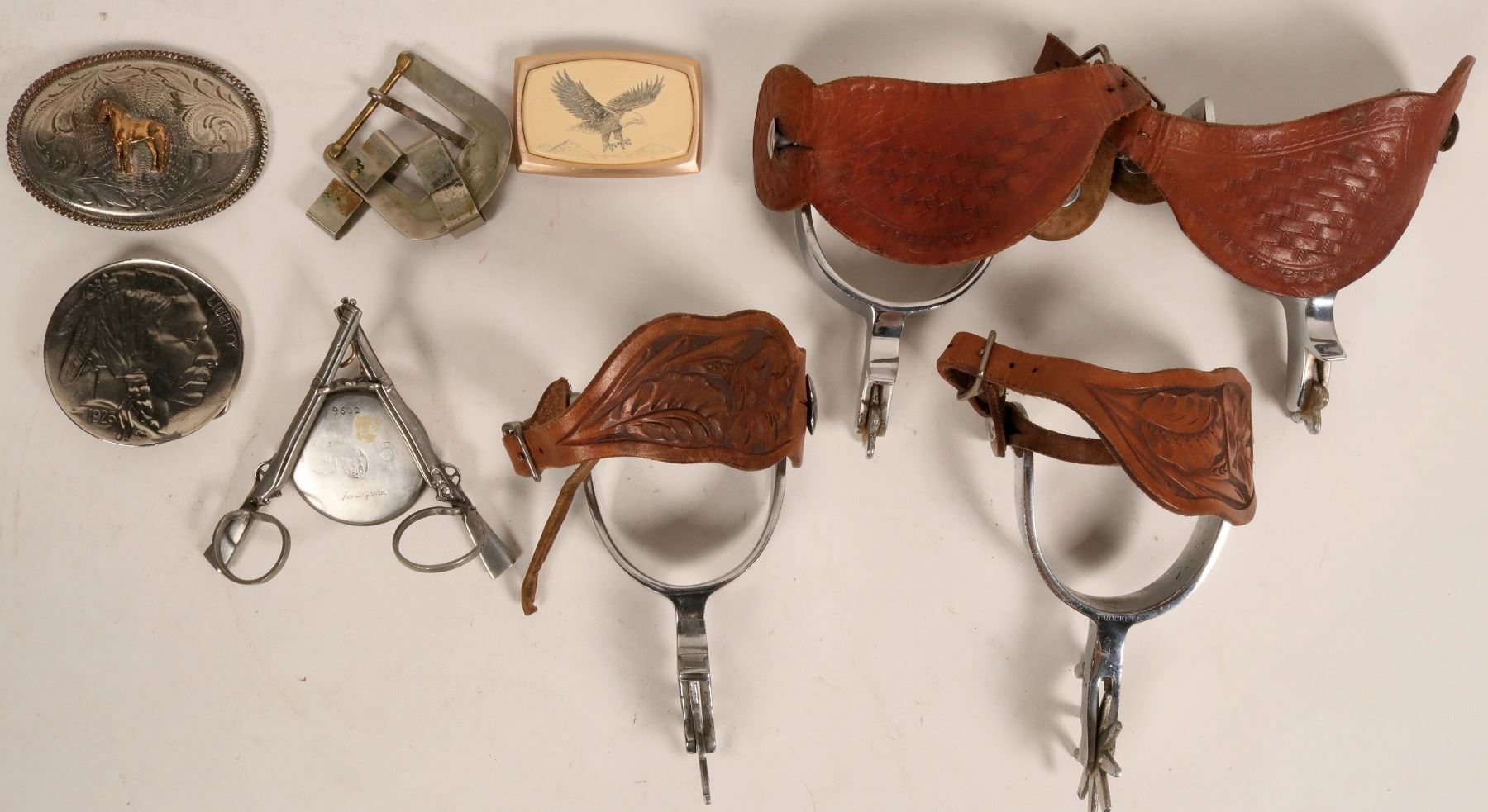 Pair of matched Texas style Crockett 1 piece spurs 6.5 inches X 3 in.wide heel. Nickel plated shank with 9 rowels, chap guards, heel leather strap, leather bootstrap and heart buttons for the spur tooled straps. (circulated 60's) Leather straps are in good condition, lightly used. A second pair of Crockett spurs light engraving 5 point rowels 6 in. X 3 in. wide heel. The leather has a basket weave design . A pewter watch stand by artist Achelle Gramba of Italy with crossed muskets, proof stamped art nouveau period c.1900-1920. Marked Etain/Zinn 101. An indian head belt buckle by the American Chicago Buckle Co. Also an aluminum belt buckle with scrimshawed eagle design. An oval tooled silver belt buckle. And a silver and brass overlay belt buckle with trim pieces.