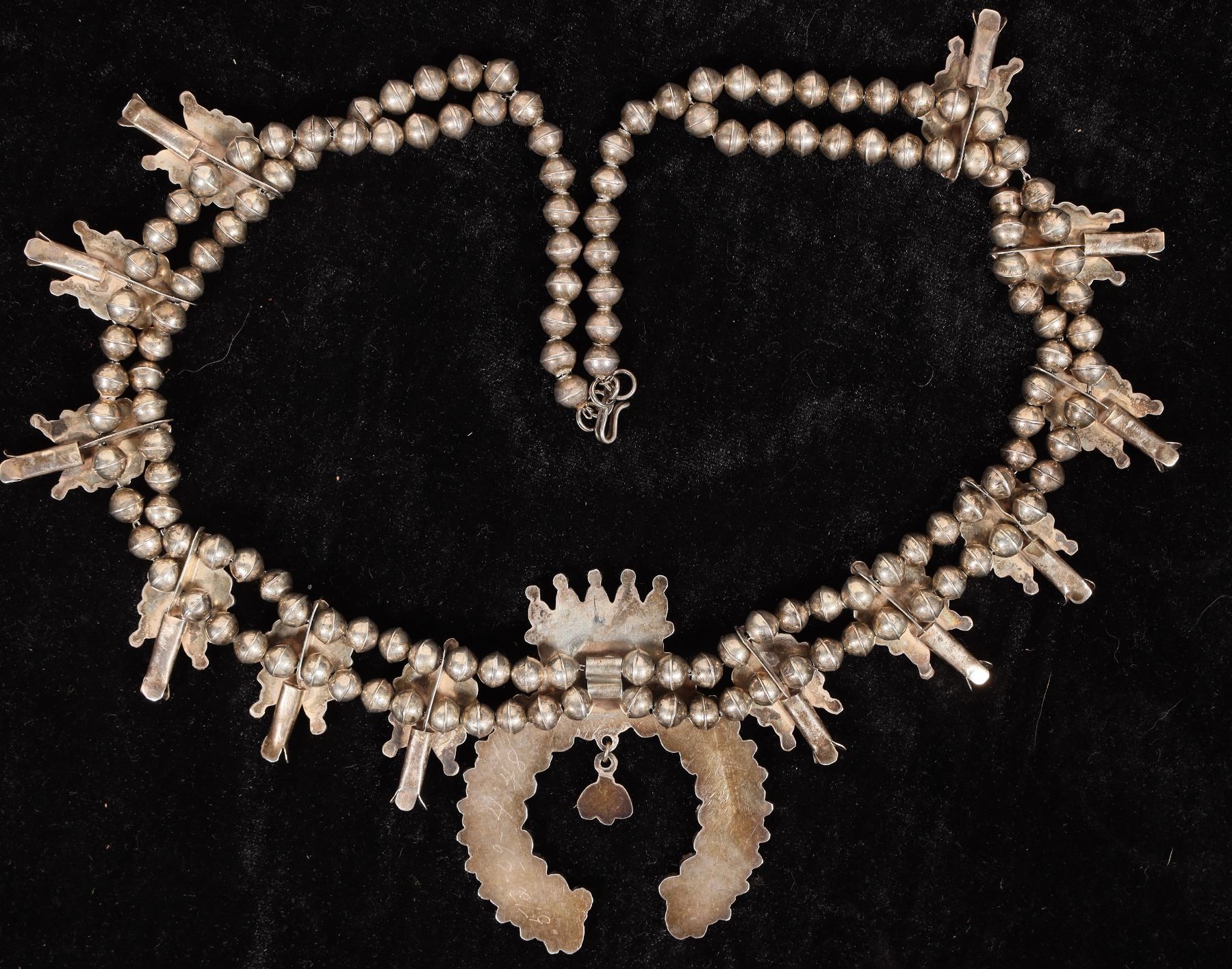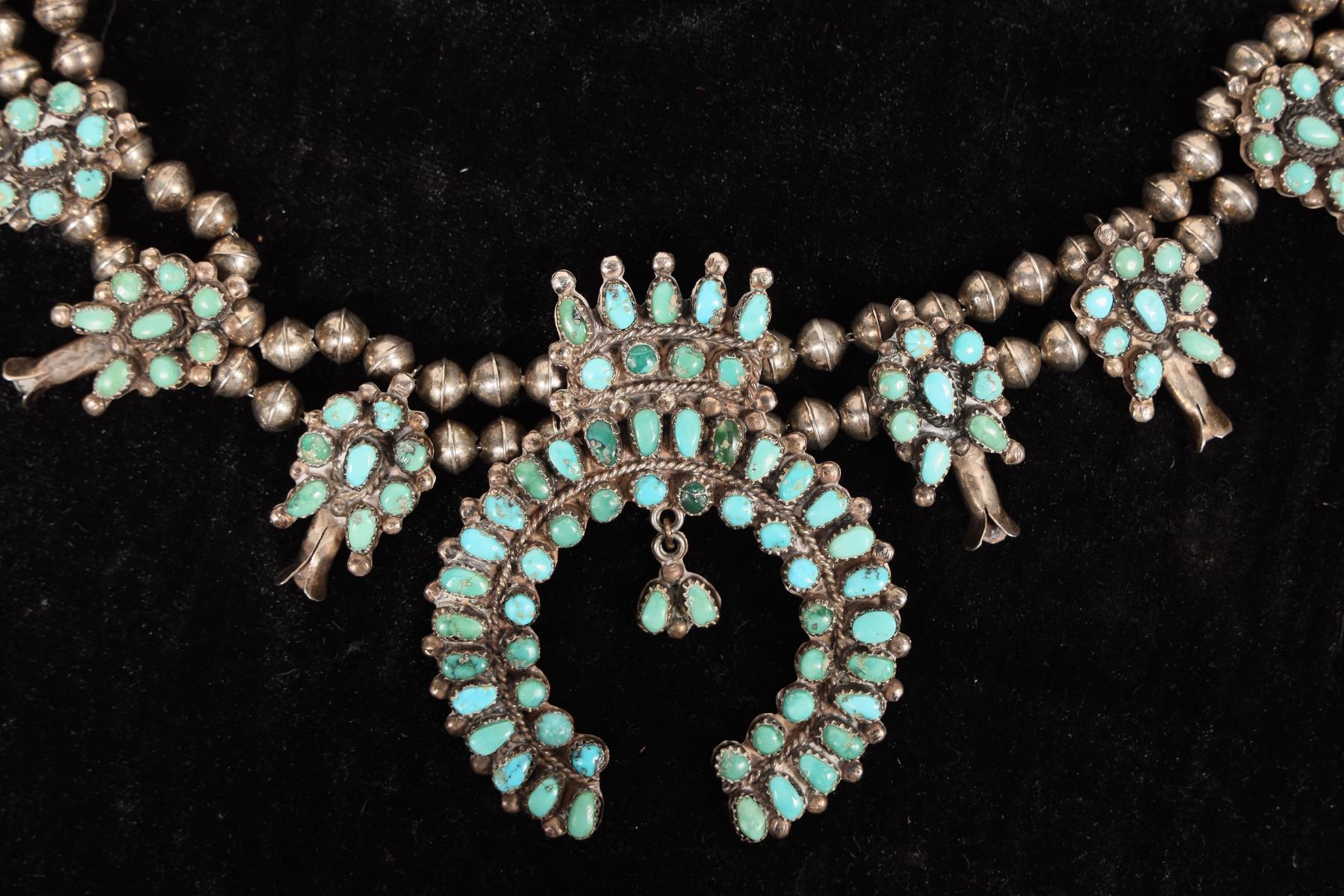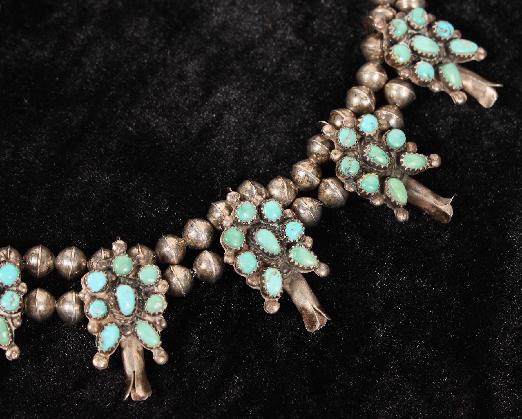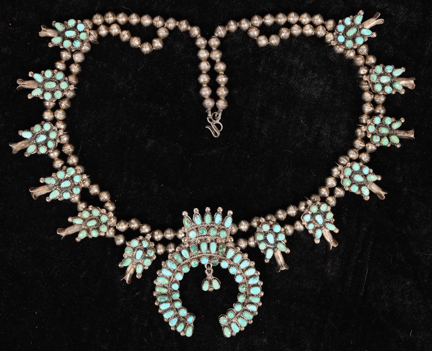 Turquoise and silver squash blossom necklace. Classic Zuni style with small older turquoise stones with a mix of blue and green round and pear shaped stones. Fine condition.