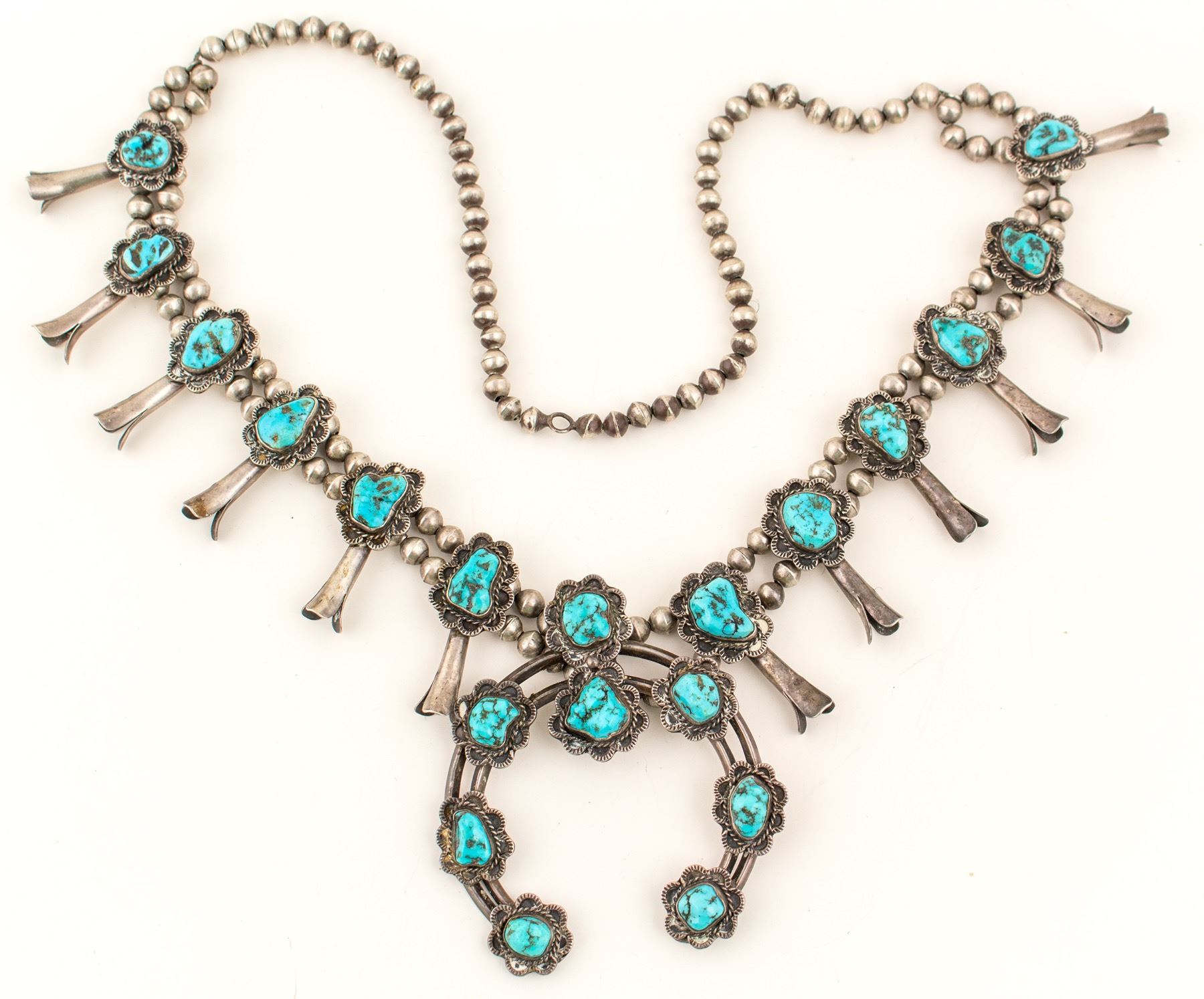 Beautiful squash blossom necklace is all handmade and is very old. The sterling silver has an even rich natural patina. 12 squash blossoms and 8 more stones on nava. Natural turquoise stones with matrix are set in smooth bezels and are all secure. 31" long. Double silver bead strand goes into single silver bead strand. State: Arizona/New Mexico City: HWAC#: 40609 Date: