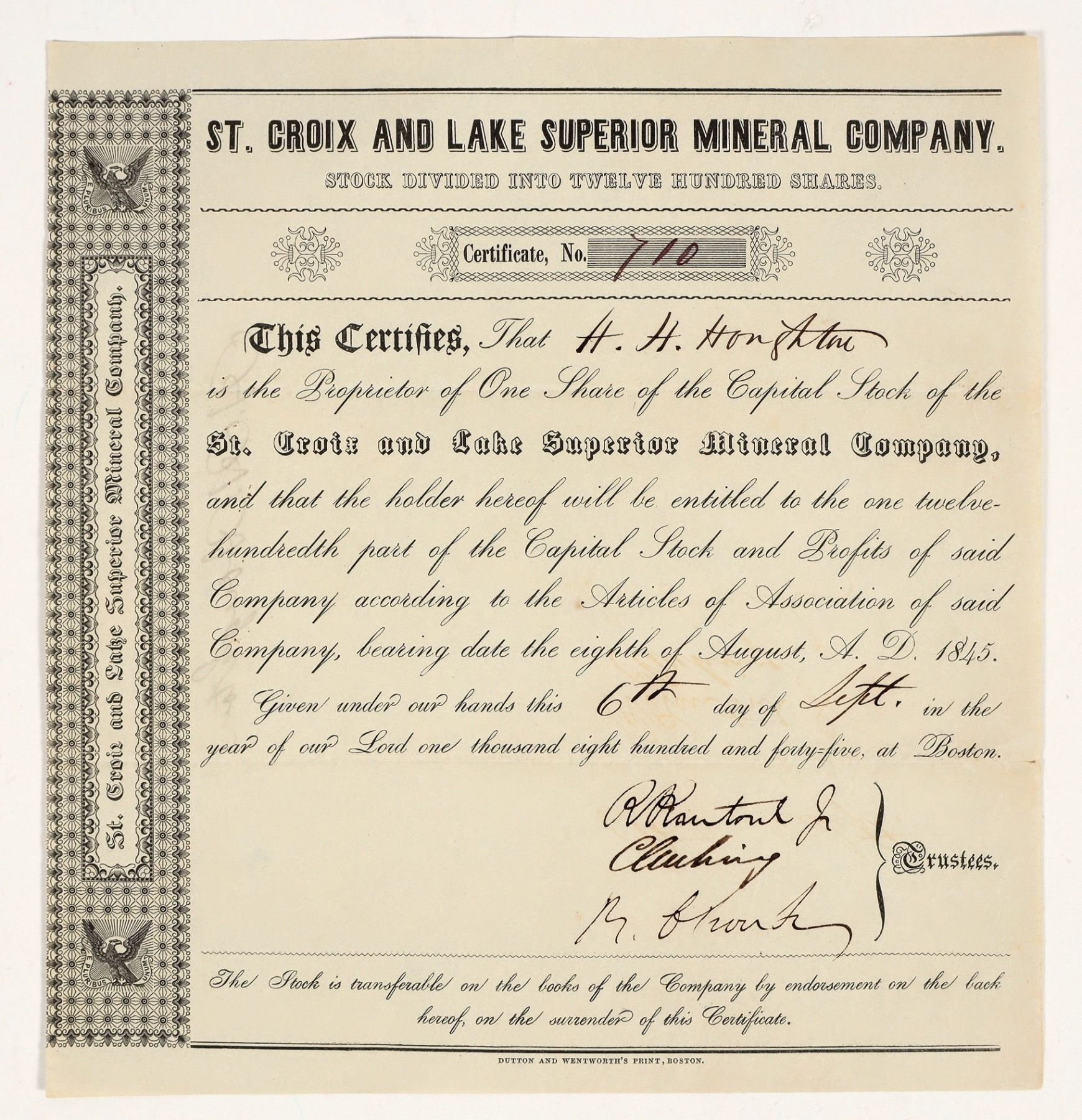This early Wisconsin company operated at Douglas, Superior County, and this certificate was signed by Rufus Choate and Caleb Cushing as trustees. Small separations at fold ends, else very fine. Rufus Choate was a lawyer, orator, and US Senator who represented Massachusetts as a member of the Whig Party. He is regarded as one of the greatest American lawyers of the 19th century, arguing over a thousand cases in a lifetime practice extending to virtually every branch of the law then recognized. Caleb Cushing was a Democratic politician and diplomat who served from 1831 to 1834 as a congressman from then as a US Senator from 1841 to 1845. He served as the 23rd United States Attorney General under President Franklin Pierce from 1874 until 1877. Cushing was later appointed the United States Minister to Spain.