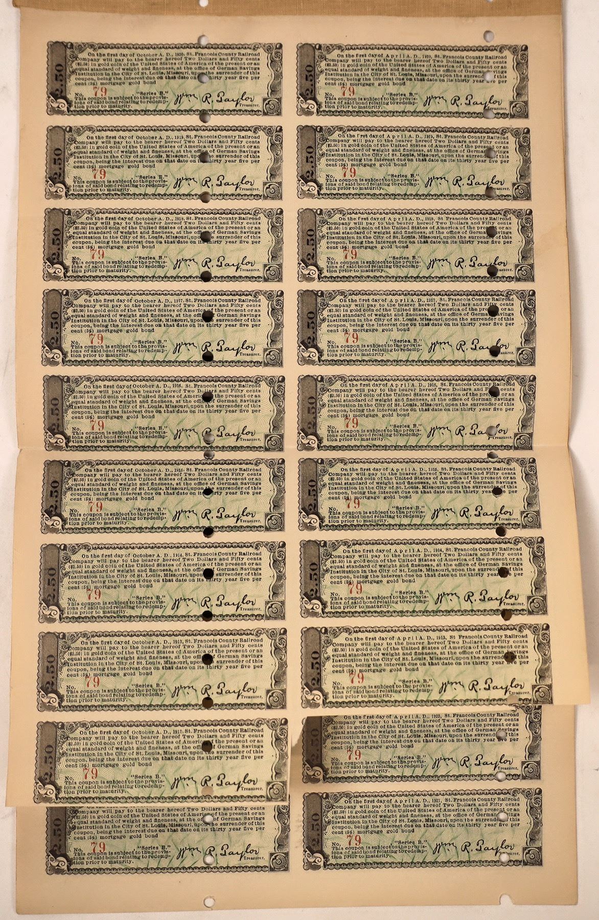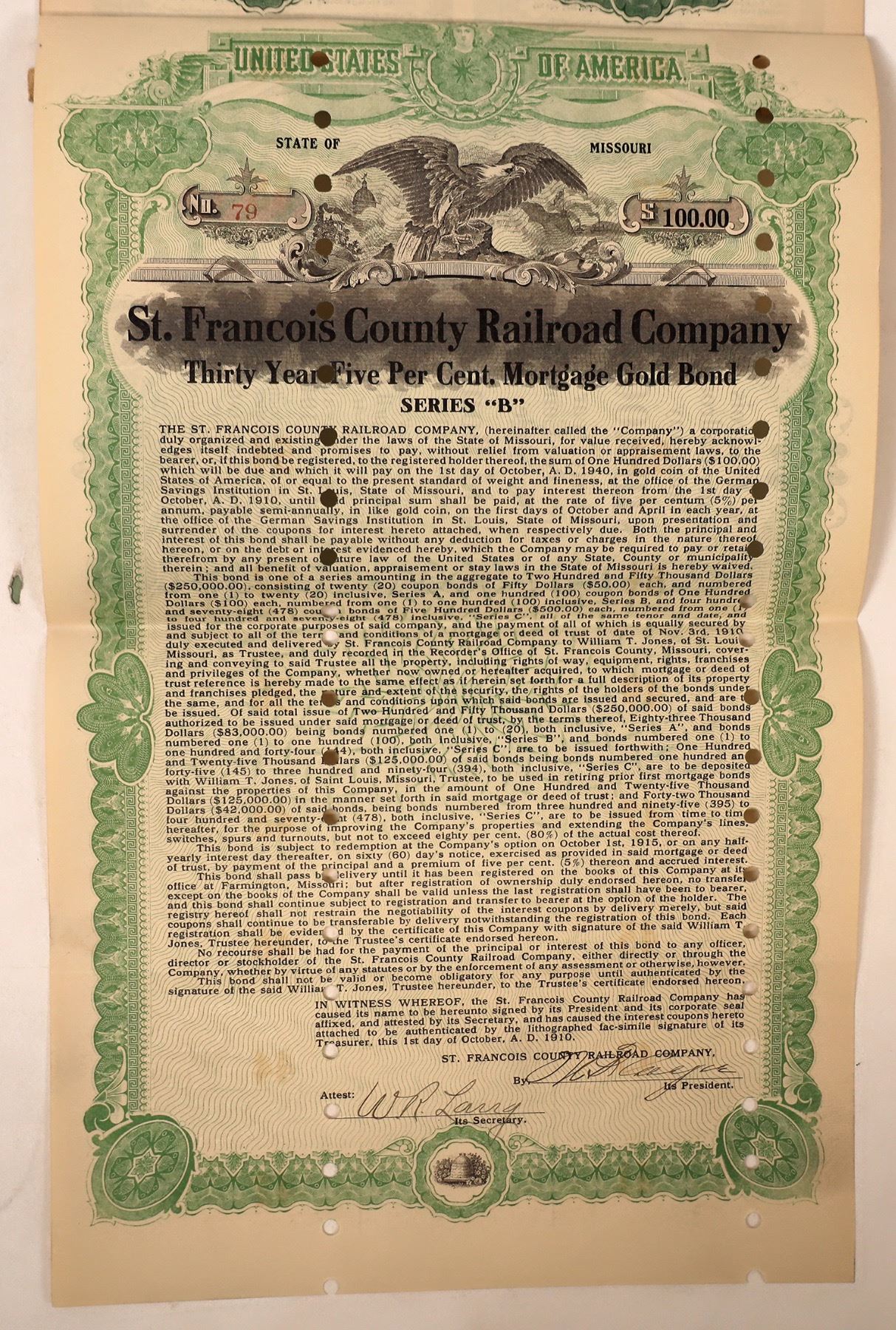 I/C 1910 St. Francois County Railroad Bond, 5% gold. Missouri Ken Prag Collection