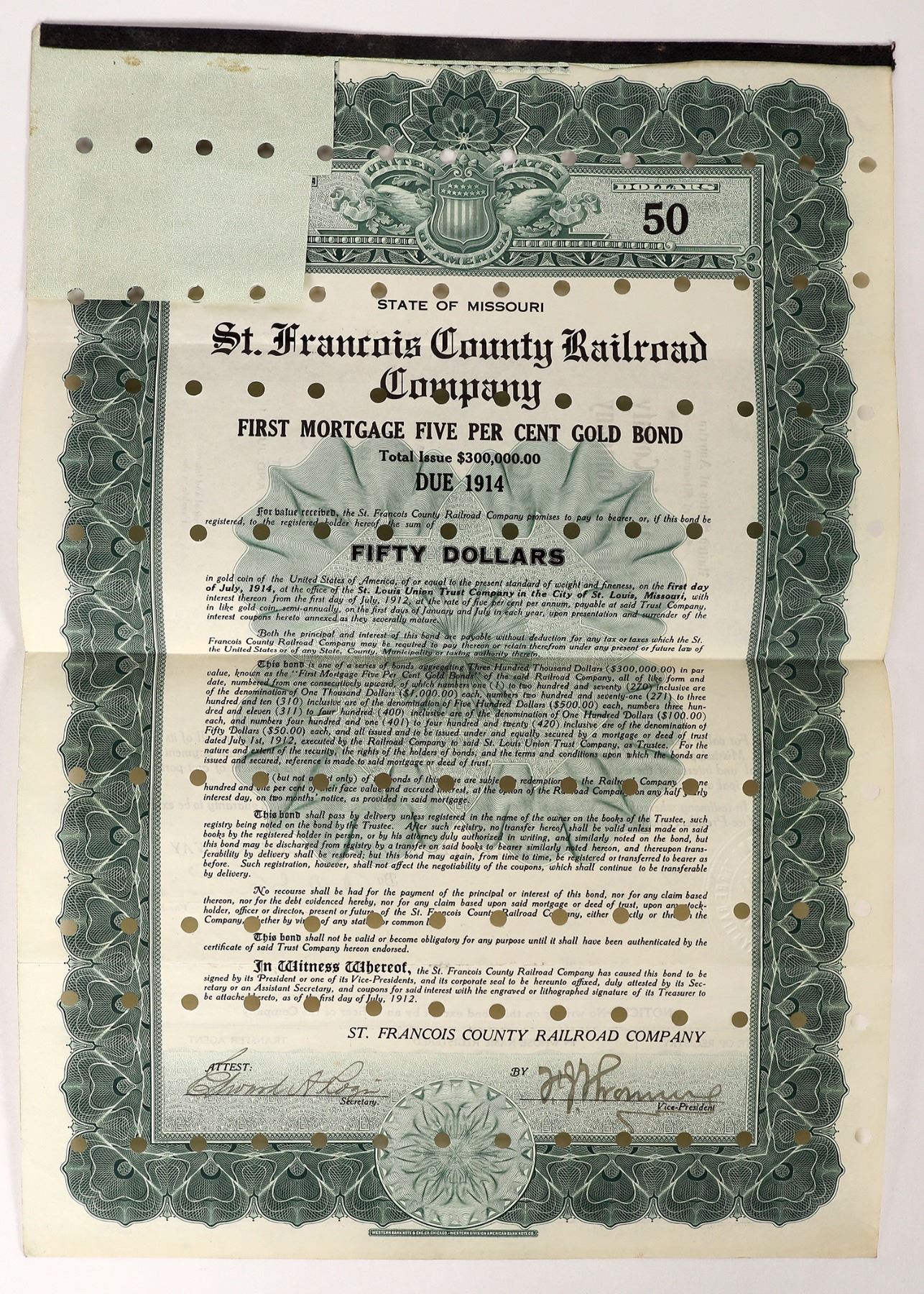 I/C 1912 St. Francois County Railroad Bond, $50 5% gold. Missouri Ken Prag Collection