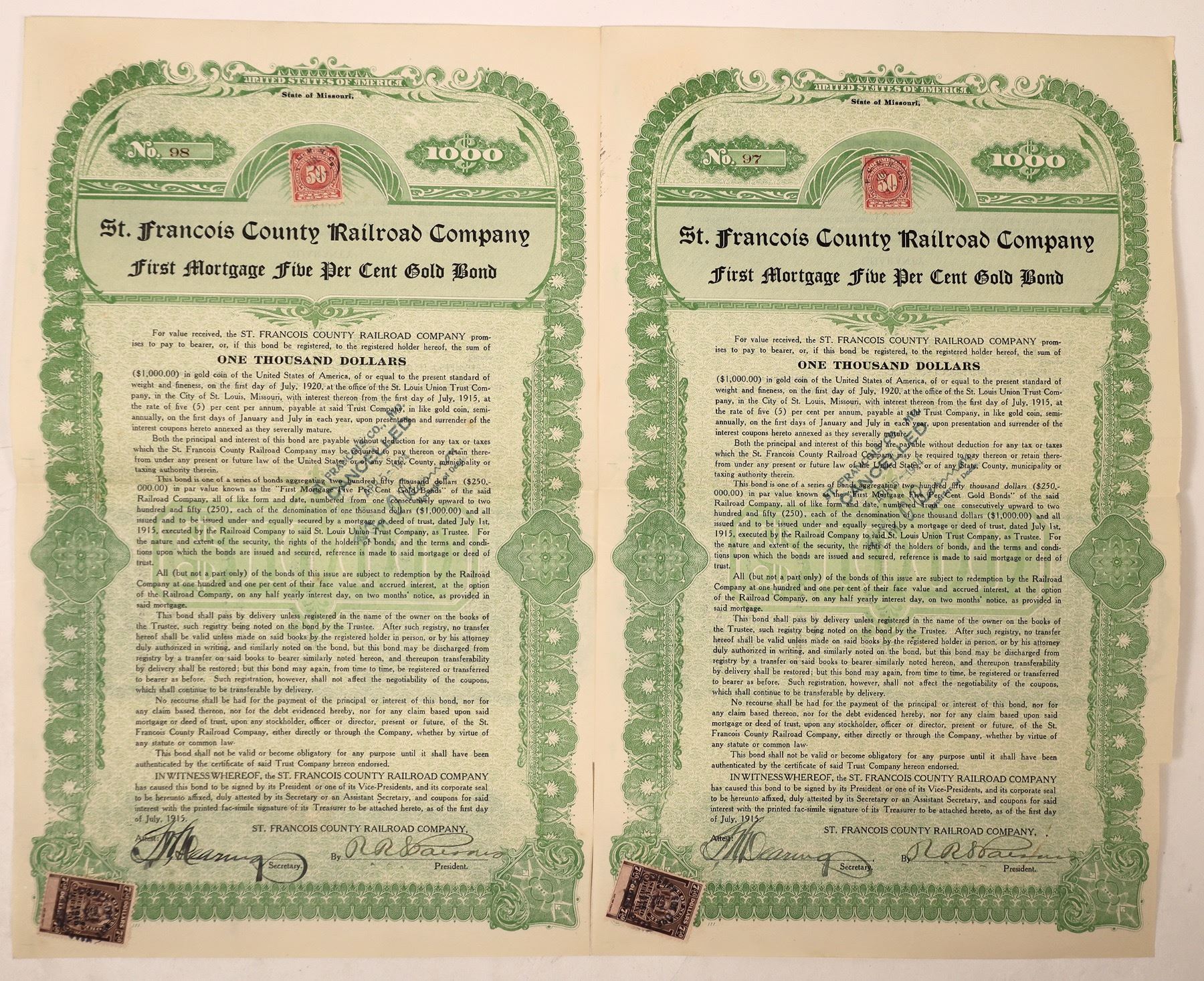 2 i/c St. Francois County Railroad Bonds, 1915, 5% gold. Both have adhesive red 50c documentary and brown $7.50 NY debt tax stamps. Missouri Ken Prag Collection