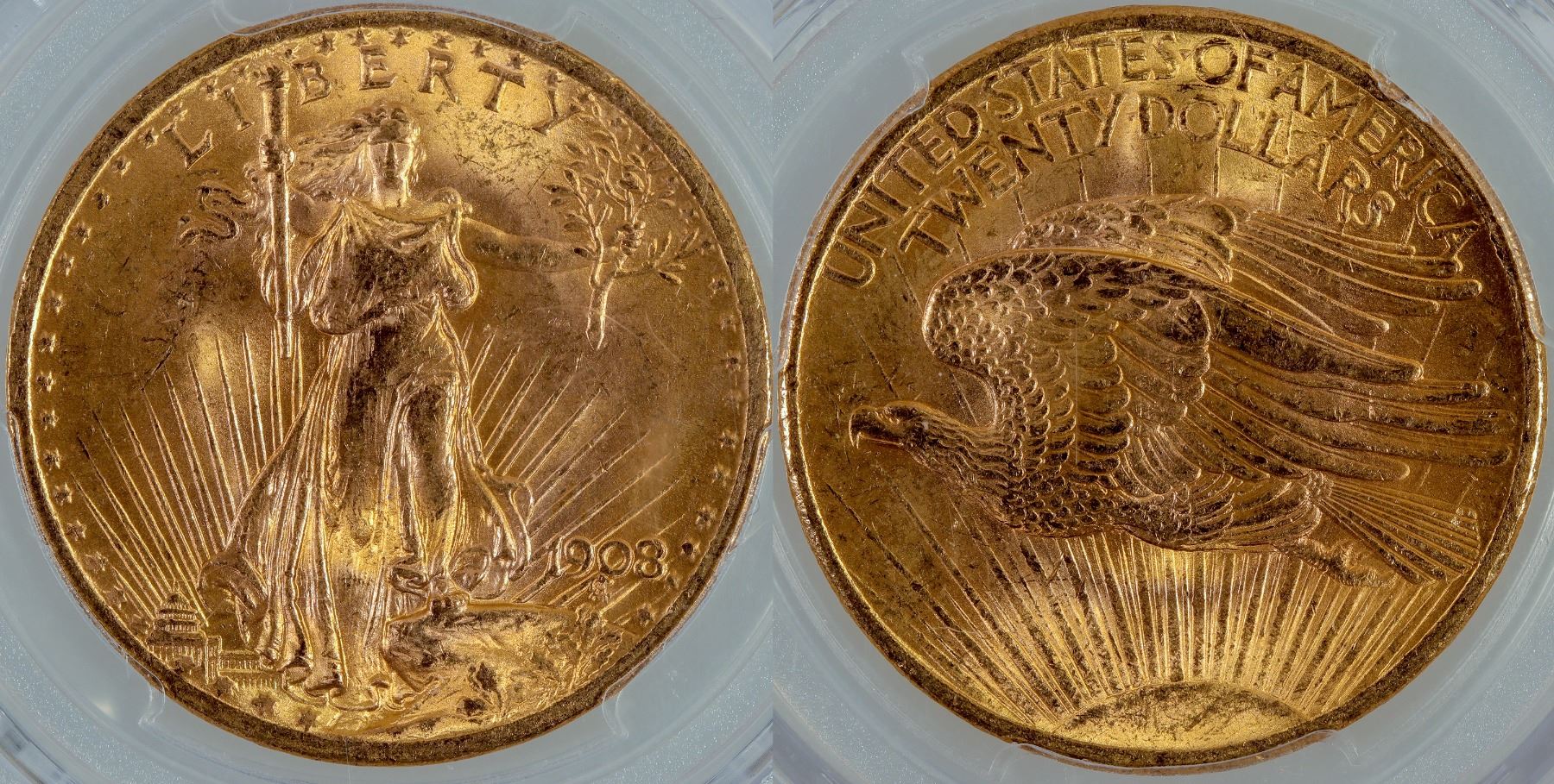 PCGS certified 1908 St. Gaudens $20 gold piece: MS 64 / No Motto/ Rough Rider Hoard with photo as Theodore Roosevelt in his Rough Rider uniform.