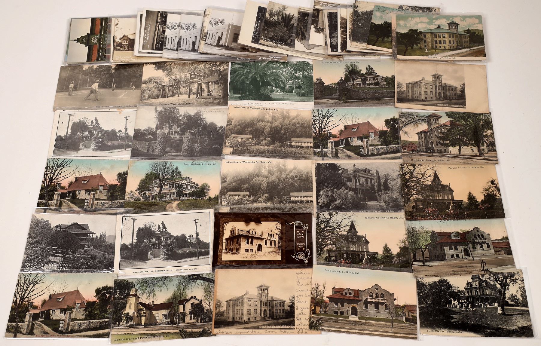 Lot of 65. Includes: 30 real photo postcards. Remaining cards are all divided back, mostly earlier printed with a handful of modern chrome. Buildings include: Grace Church; high school; Presbyterian Church; Grammar School; Post Office; Union Grammar School; Public Library; Old Mill; SP Depot; Elmhurst Academy; Woodworth's New Hotel; and more. Duplication. State:California City:St. Helena Date: Provenance: Ken Prag Collection