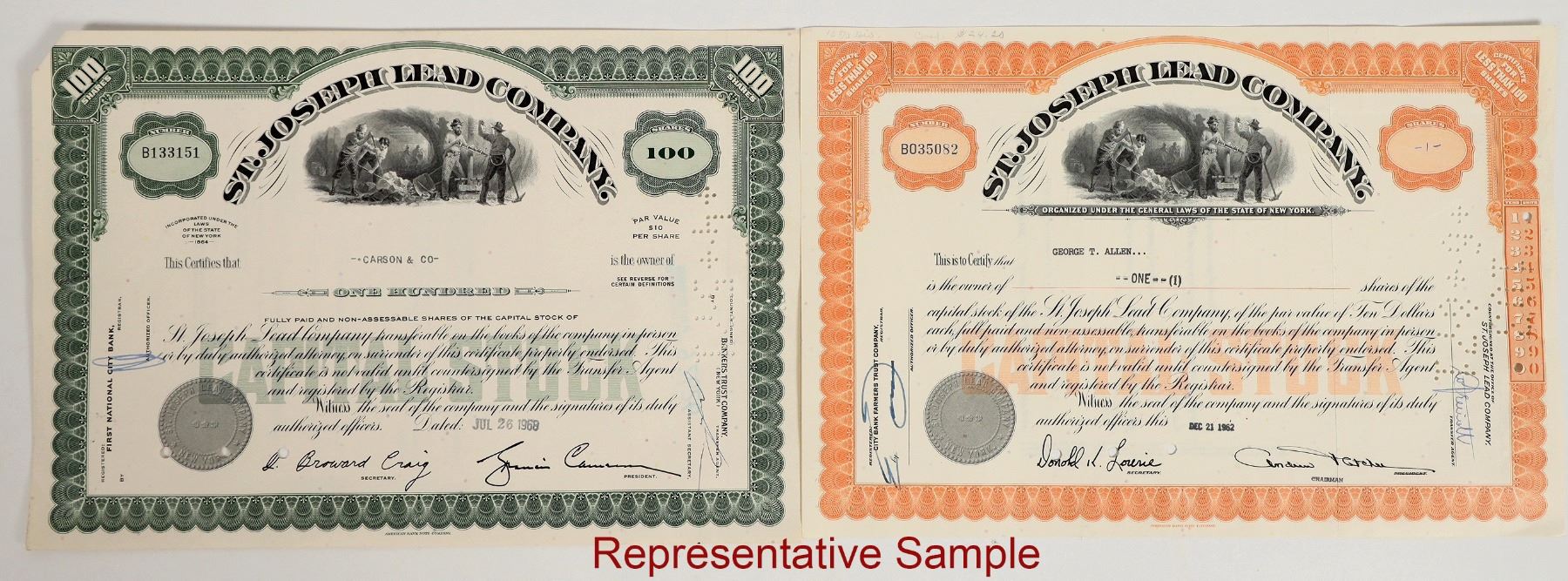 About 120 St. Joseph Lead Company Stocks c.1960s. Issued. Two varieties, orange and green. The company mainly operated in Missouri with historical records indicating a corporate headquarters in Pittsburgh, Pennsylvania. See photos.