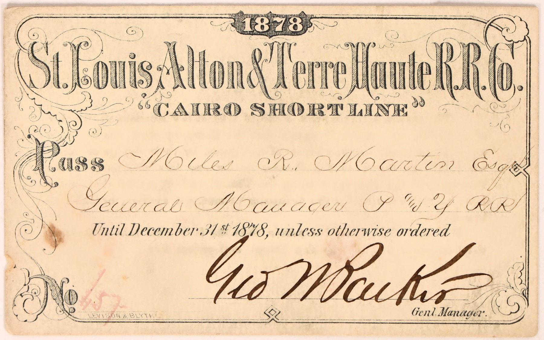1878 St. Louis, Alton & Terre Haute R R pass, hand signed by Geo illegible GM.