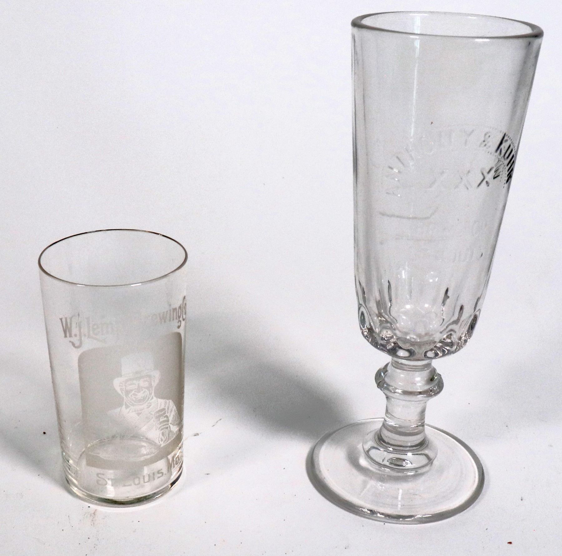 2 St. Louis beer Glasses. Etched tin wall glass W J Lemp Brewing 3.4x2". Embossed Anthony & Huhn, heavy glass 7x2.25" St. Louis Missouri