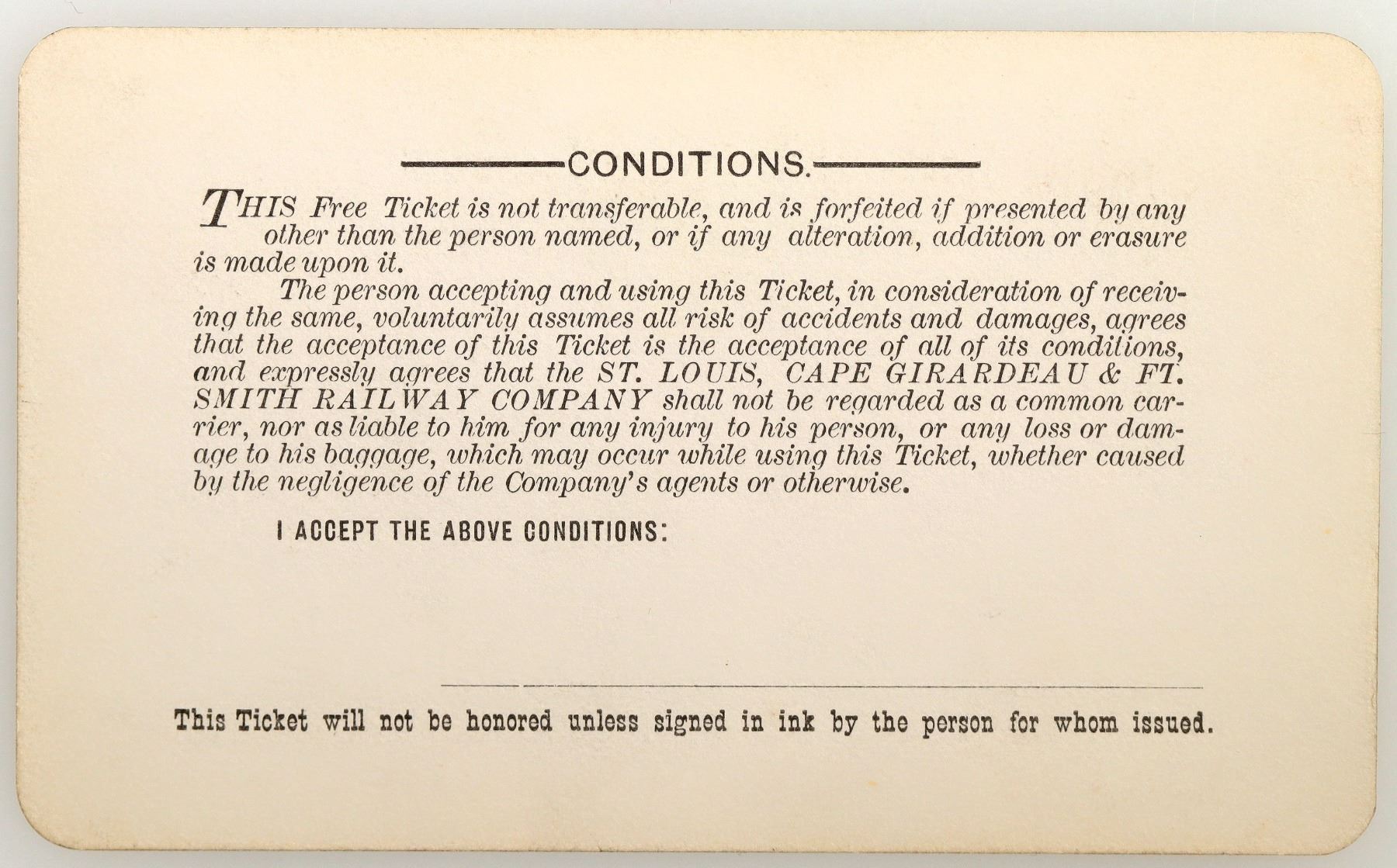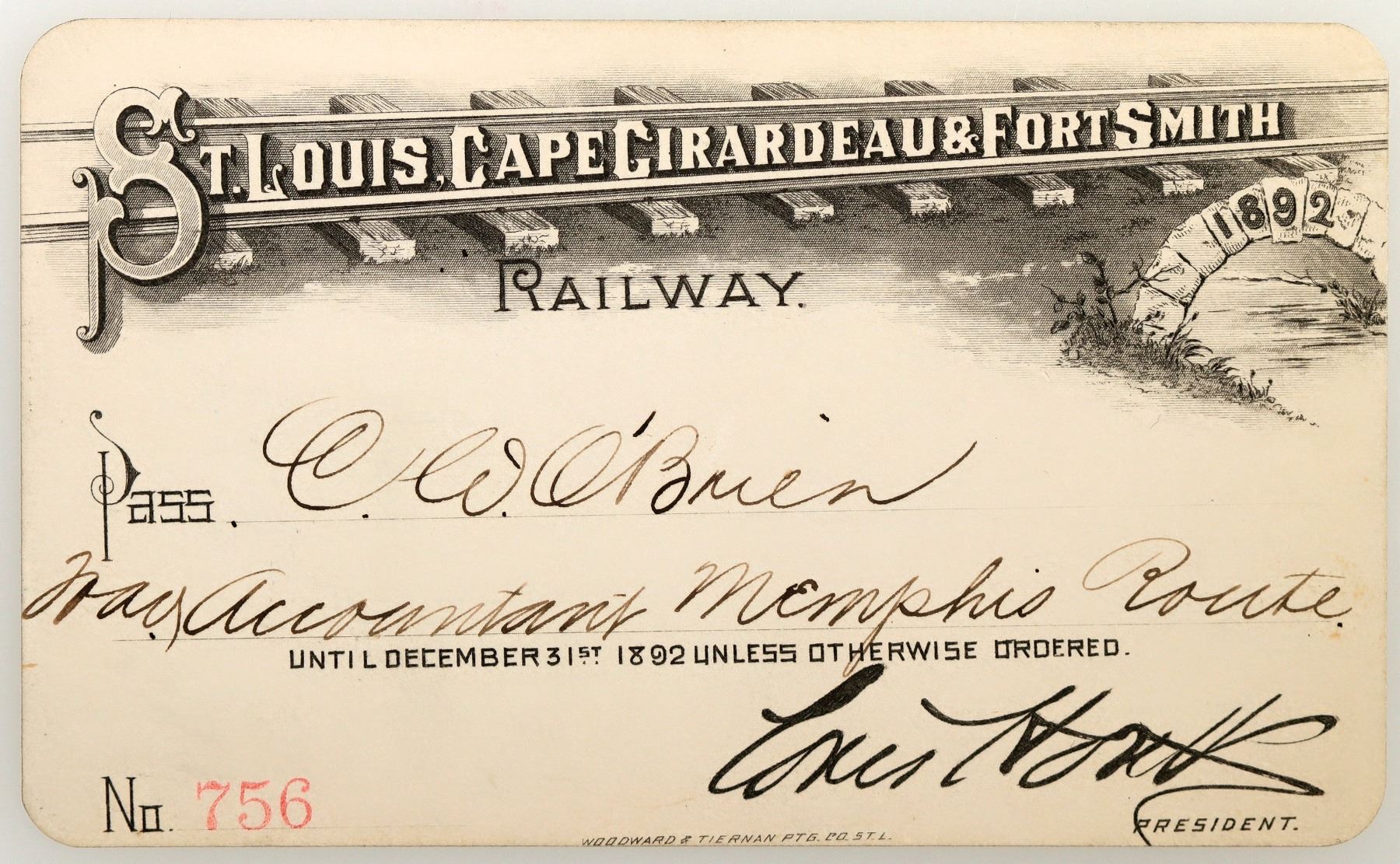 Great looking pass issued for the year 1892 to CW O'Brien of the Memphis Route. Preprinted signature of the president. Design has bridge and track vignette incorporated into the title. Printed on cardstock by Woodward & Tiernan. Operated 1891-99 when it became part of the Southern Missouri and Arkansas Railroad.
