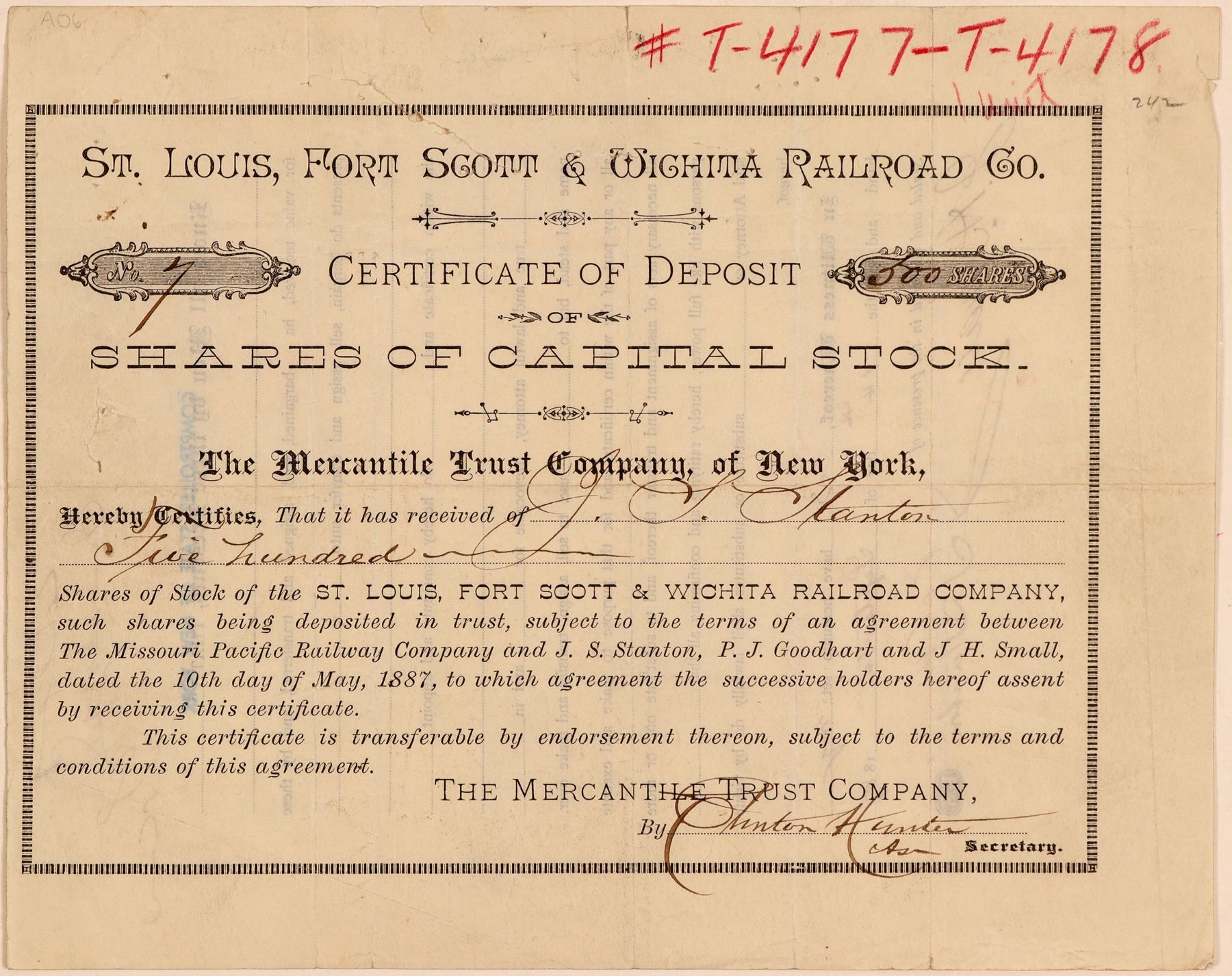 A subsidiary of Missouri Pacific incorp 1879 Kansas, started operations in1880 and stopped service in 1887. #7, I/U, Certificate of Deposit on 500 shares issued May 10, 1887 to J.S. Stanton. BLACK, no vignette. Unknown printer. Rare, no known prior existence. F-VF Ken Prag Collection