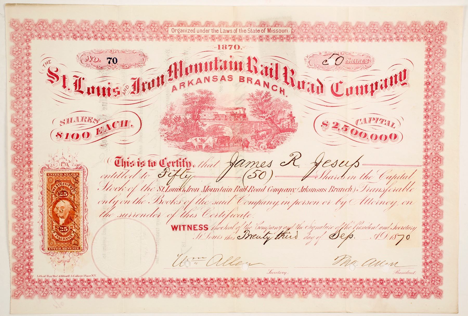 50 shares of St. Louis and Iron Mountain Rail Road Co. stock cert. #70, dated Sept 23, 1870 issued to James R. Jesup, signed by Wm. Allen, secy. and M. Allen, pres. Adhesive RN stamp - one on front and one on back. Assigned May 16, 1877. Raised co. seal. Listed in Cox. St. Louis, Iron Mountain and Southern Railway was historic railroad that operated in Missouri and Arkansas during the late 19th and early 20th centuries. Ran from St. Louis, MO, to Texarkana, AK and SE Missouri. Established to deliver iron ore from Iron Mountain, MO to St. Louis. Railroad was robbed twice: 1) James-Younger Gang on Jan. 31, 1874, at Gad's Hill, MO, 2) "One-Time Train Robbery Gang" Nov 3, 1893, at Olyphant, Ak . RR acquired by Jay Gould in 1883 and then merged into the Missouri Pacific RR and then the Union Pacific in 1982. Printed: Lith of Hay Bro & Hiltorff, 5 College Place NY. Prag collection. State: National Rails City: Date: 1870