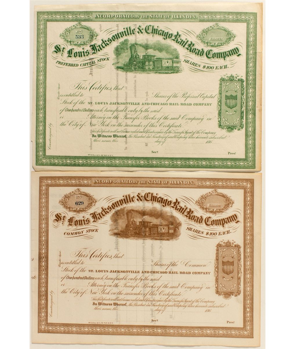 Two unissued certificates, one green and the other rust colored. 186-. Same locomotive vignette. The rust certificate still has the stub attached. Very clean and crisp. Date , IL hwac 20879